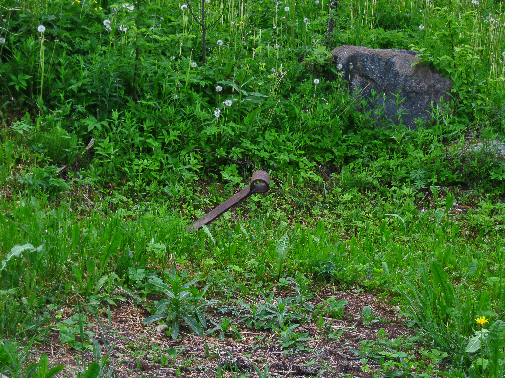 Сохранившийся надгробный камень с монастырского кладбища. Рядом постамент от первого поклонного креста, установленного в 2006 году. Он был чугунный и его кто-то украл через два месяца после отъезда членов экспедиции