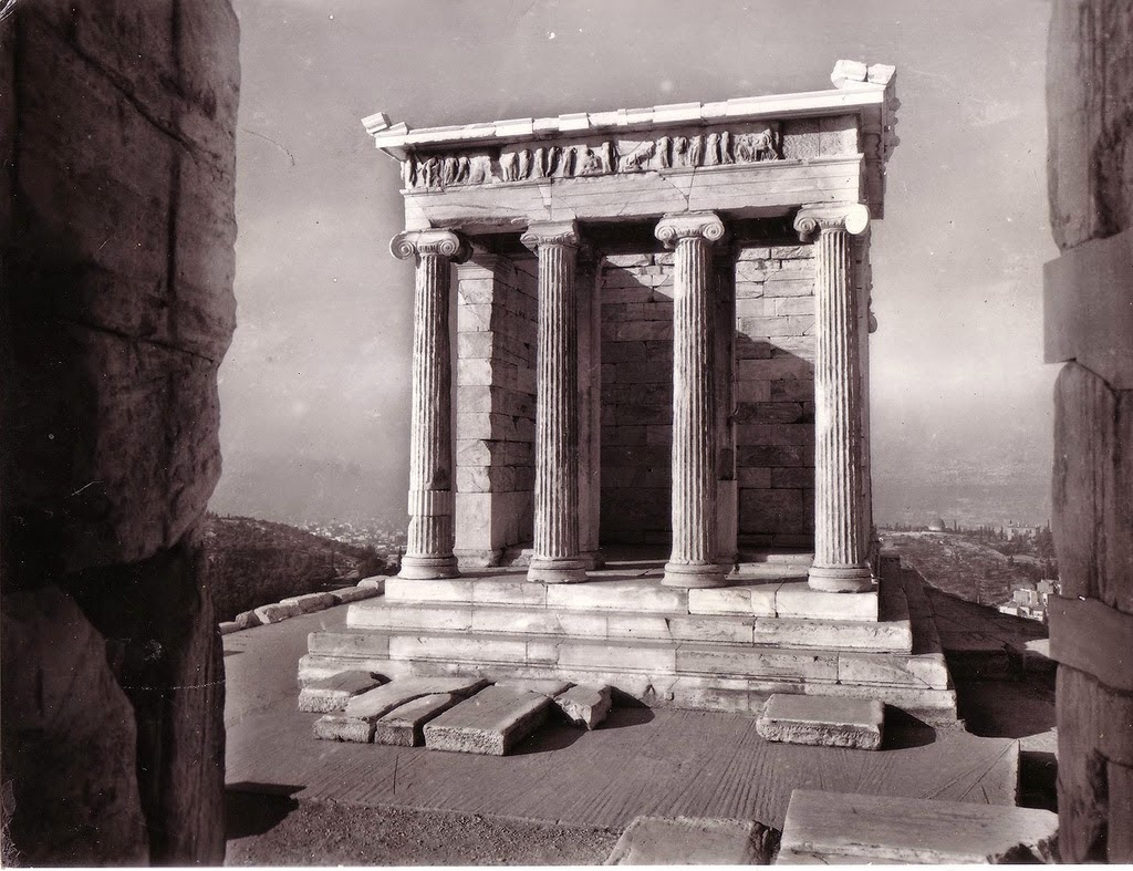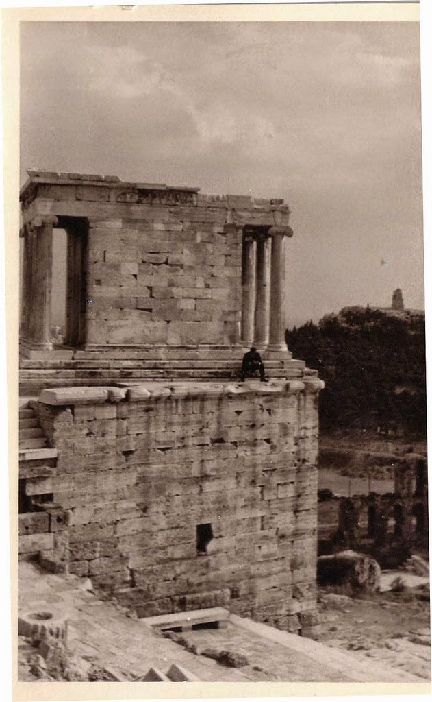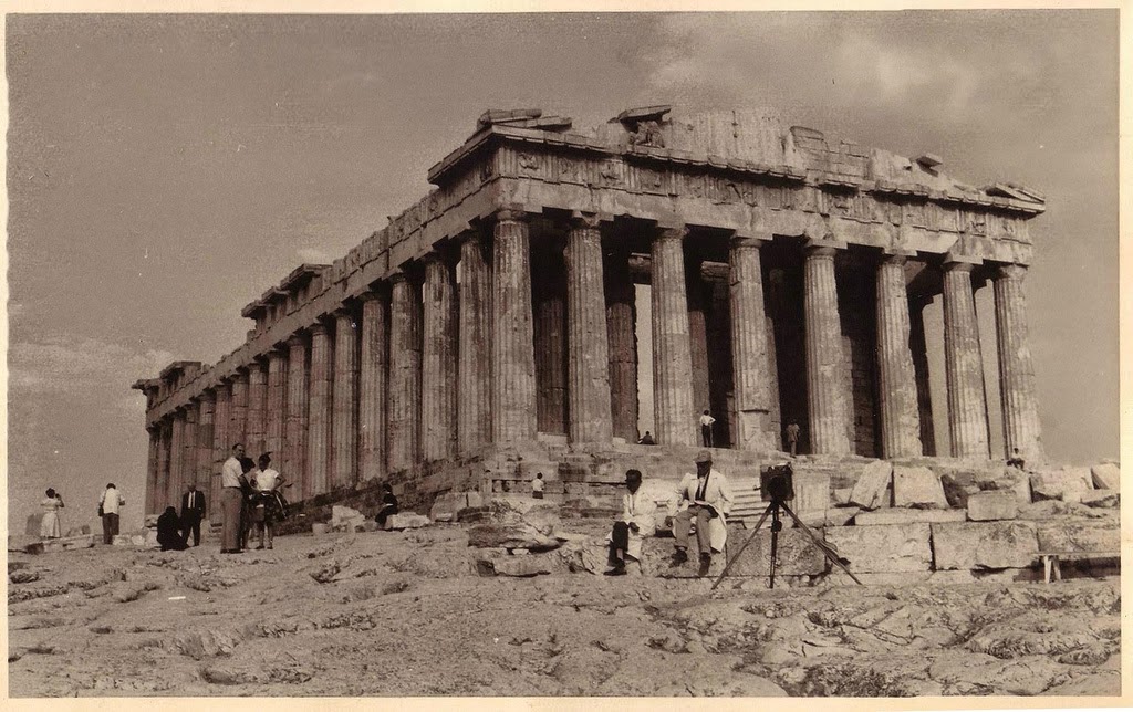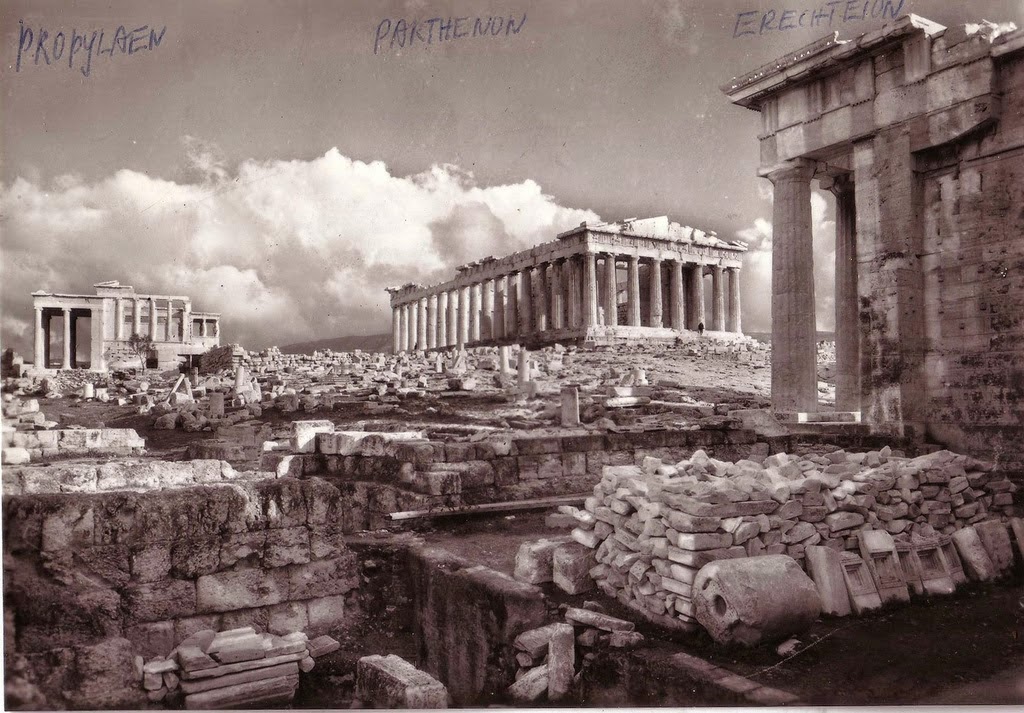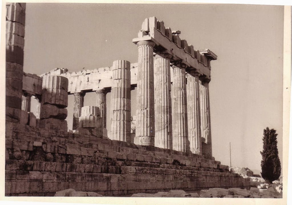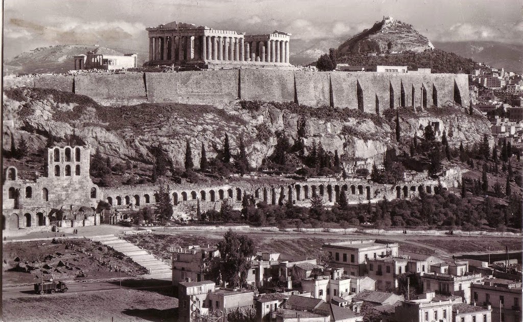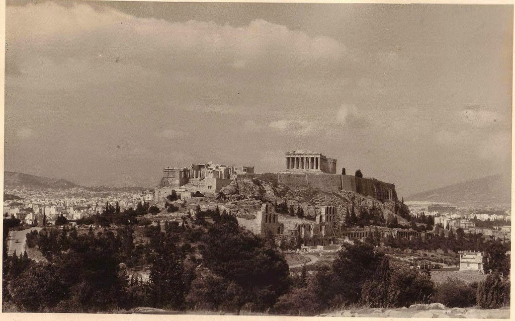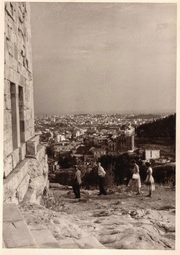Афинский Акрополь-акрополь в городе Афины, представляющий собой 156-метровый скалистый холм с пологой вершиной (ок. 300 м в длину и 170 м в ширину). Фото 1961 года.