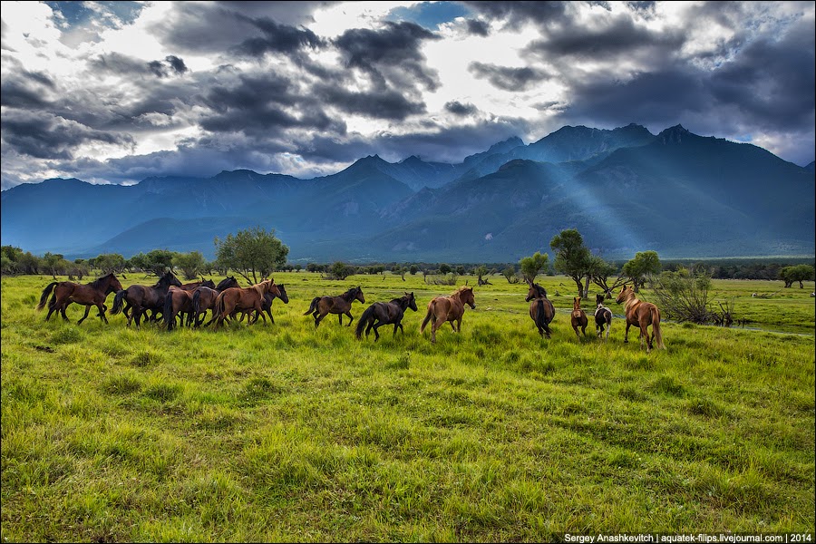 Невероятные по красоте просторы, неизгаженная природа, горные хребты и раскинувшаяся между ними долина с быстрой рекой, предгрозовое небо с едва прорывающимися сквозь него солнечными лучами…