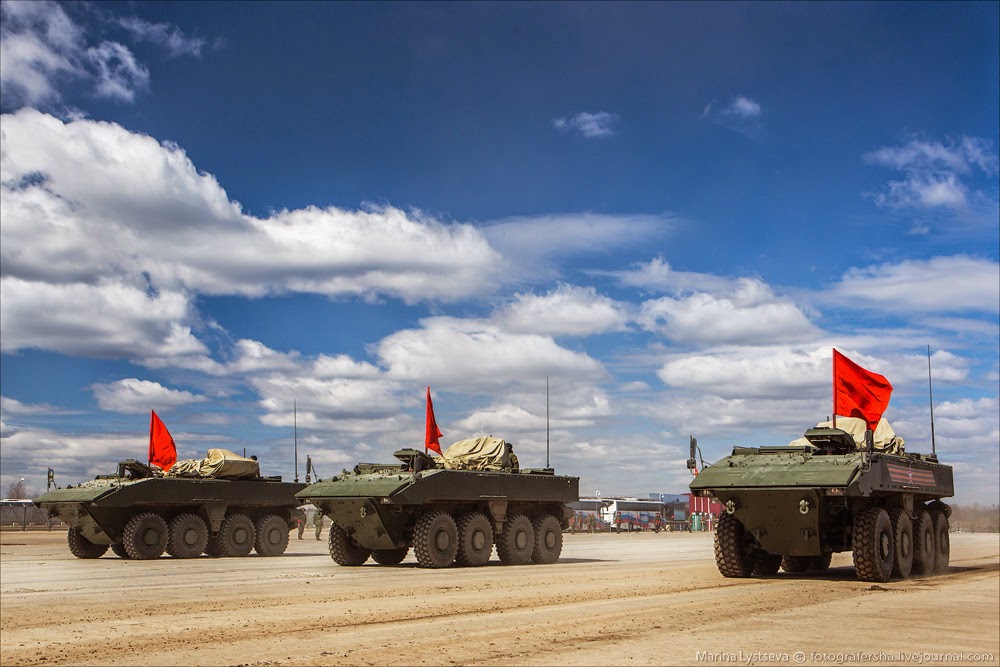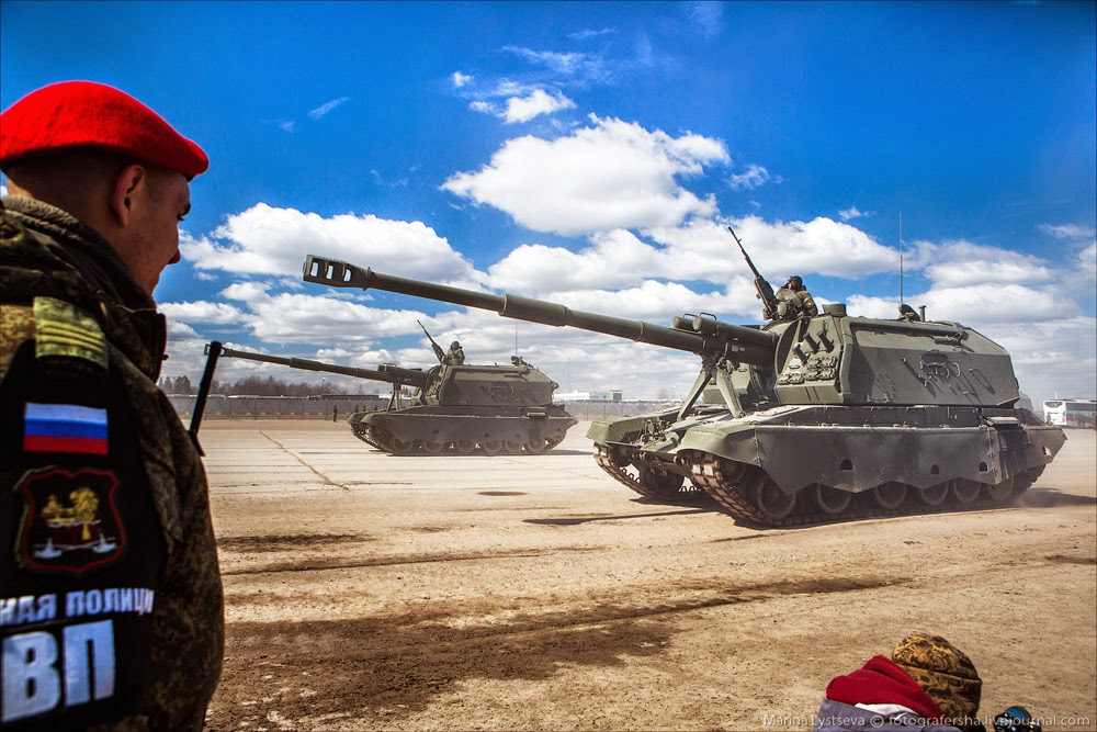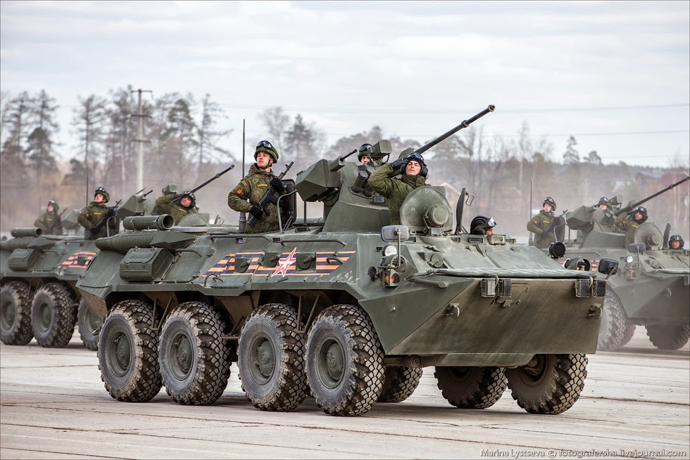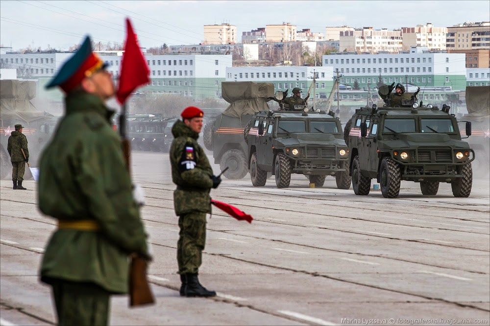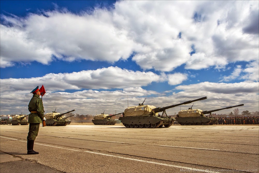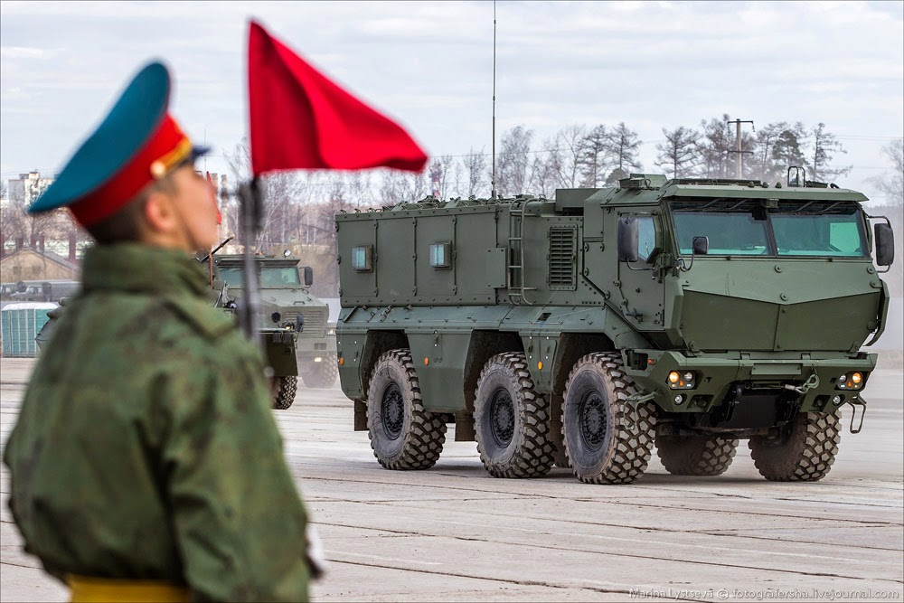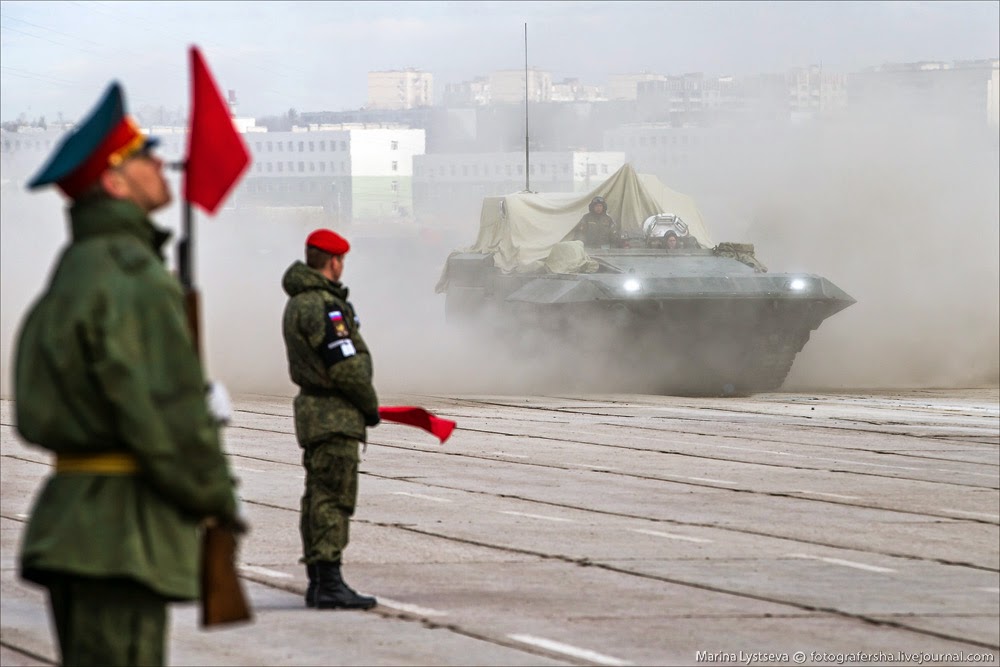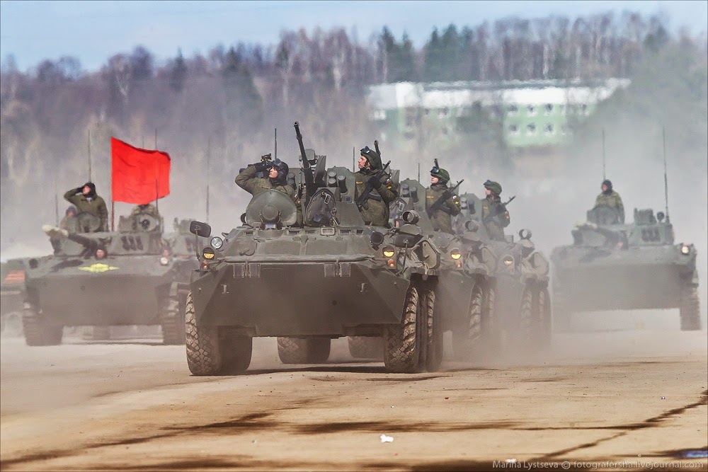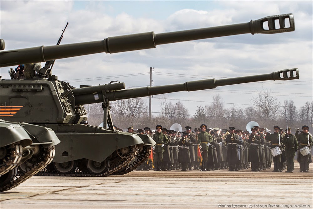 В подмосковном Алабино на площадке, имитирующей Красную площадь, завершаются тренировки сводного парадного расчёта, сформированного для участия в военном параде, посвященном 70-летию Победы ВОВ.
