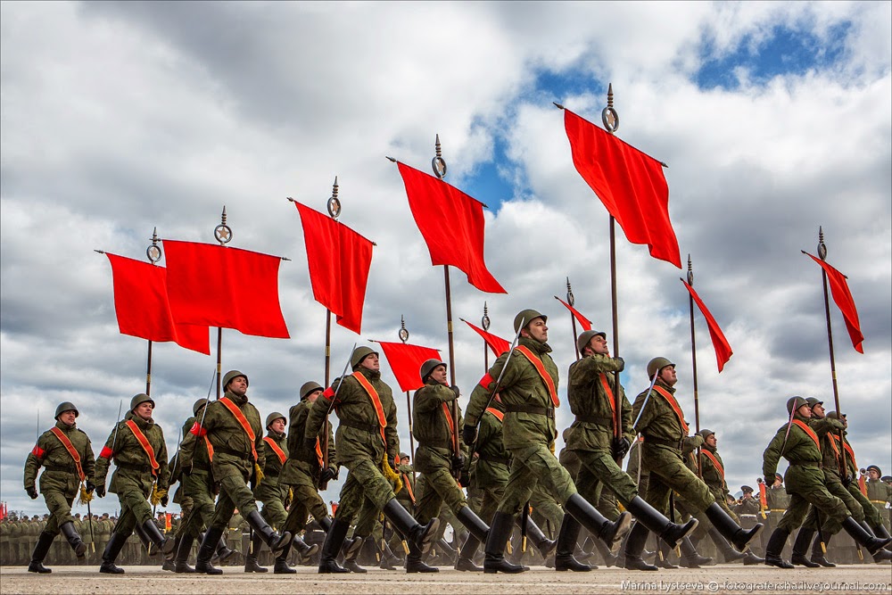 Начинается проход пеших колонн. Первыми идут ребята, одетые в форму и с военными флагами Великой Отечественной Войны.