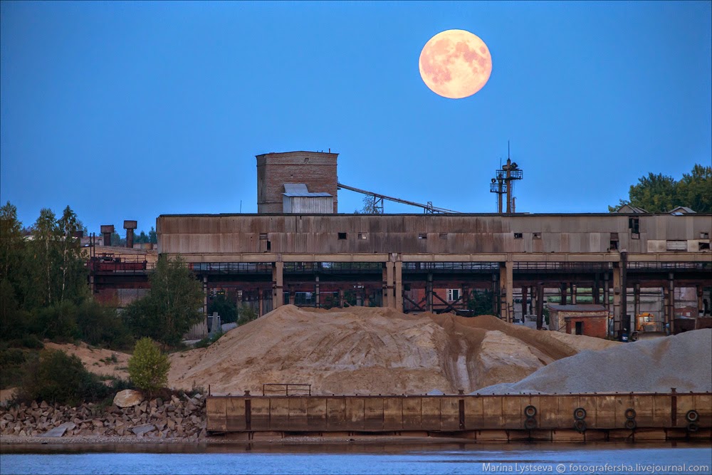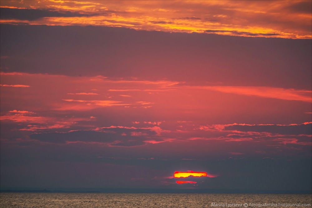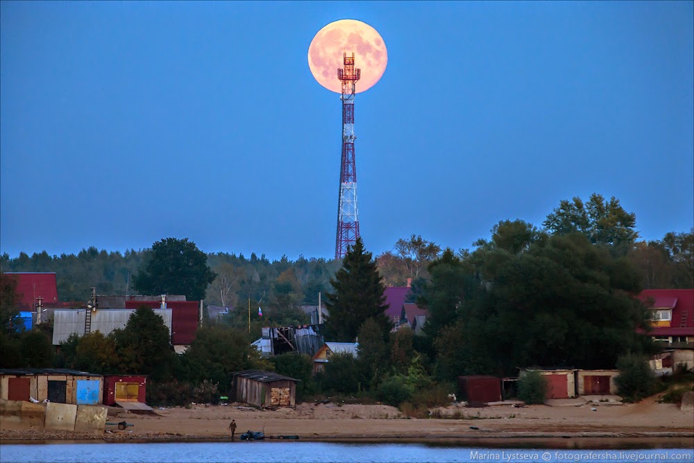 Солнце садилось в 20:03, а луна начала подниматься в 19:55 и оба светила одинаково низко зависли над горизонтом.