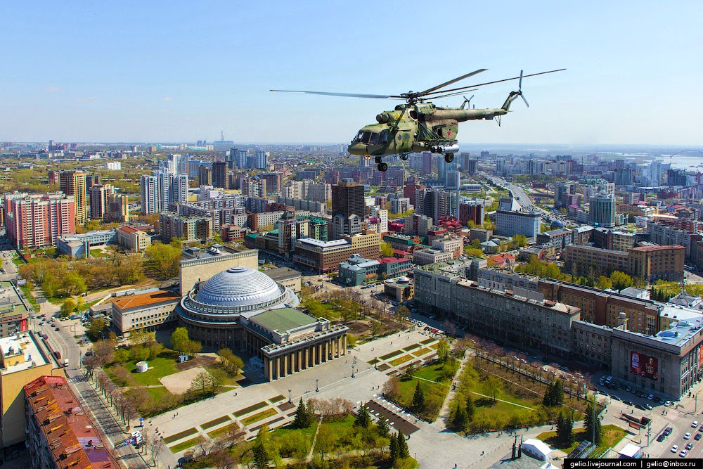 Группа пролетает мимо самого высокого здания Новосибирска ("Бэтмен", 88 метров).