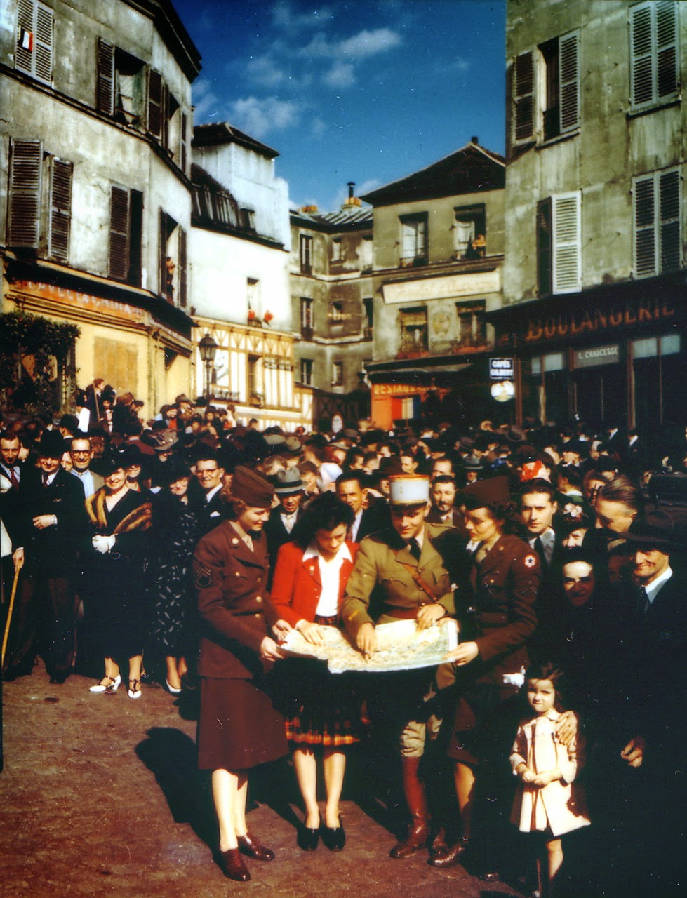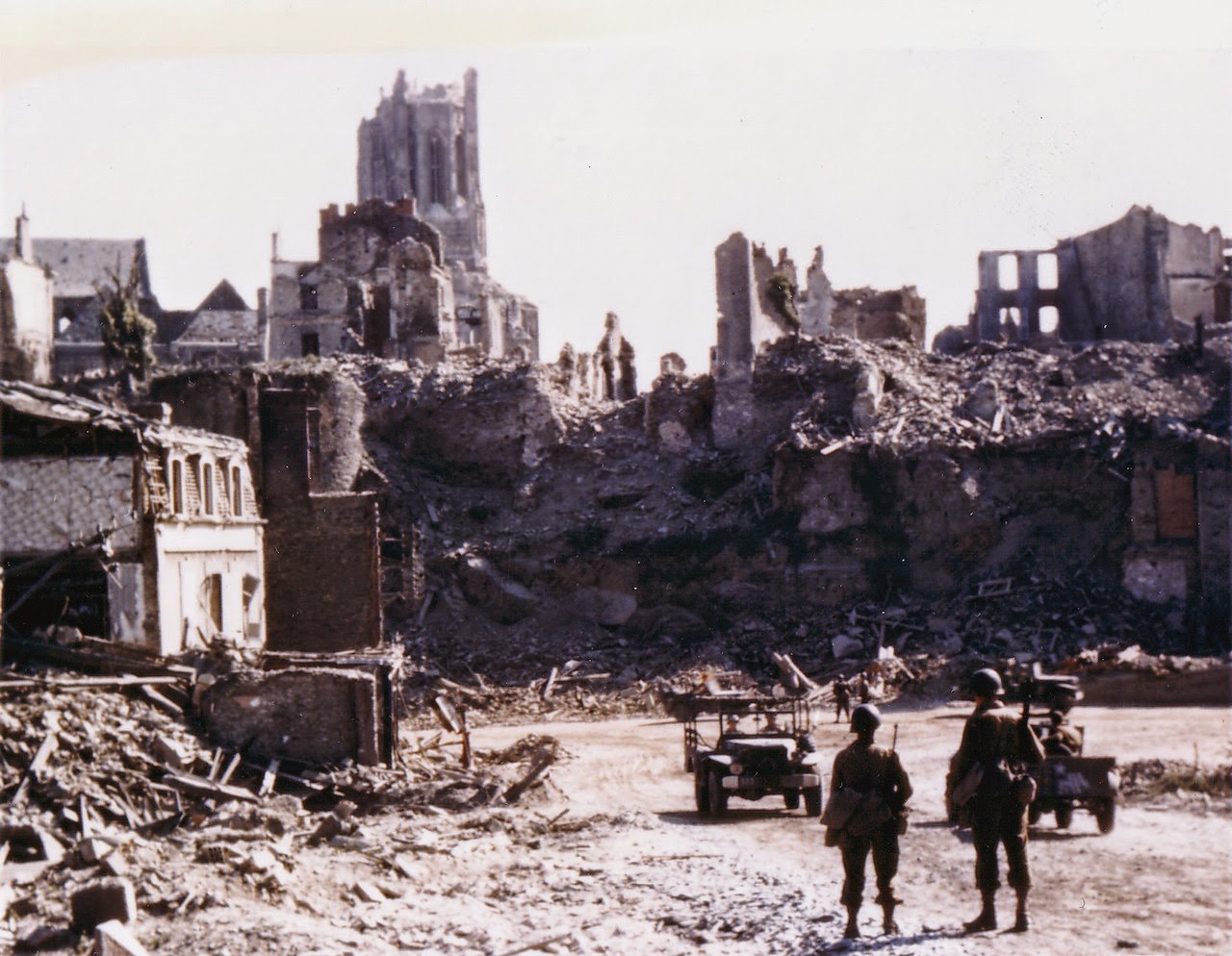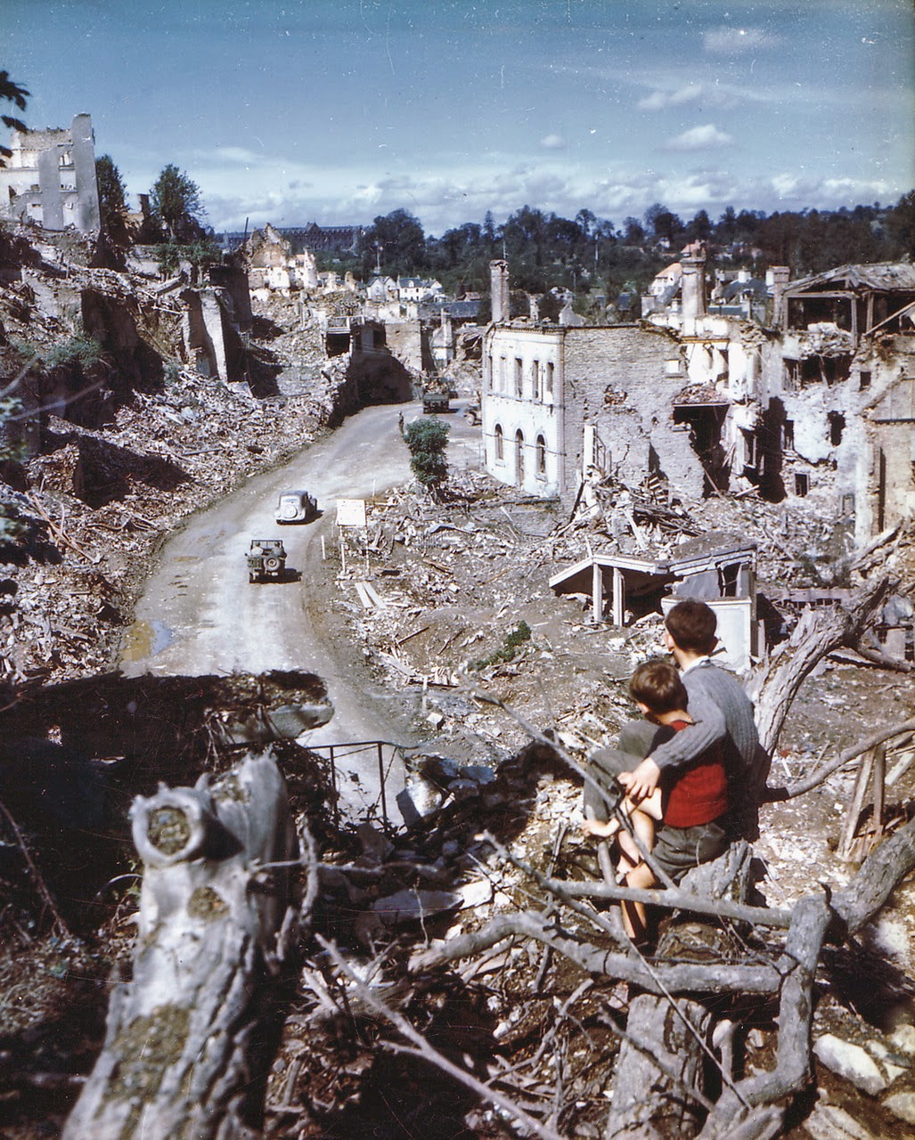 Сен-Ло. Дети из развалин смотрят на проезжающую американскую технику