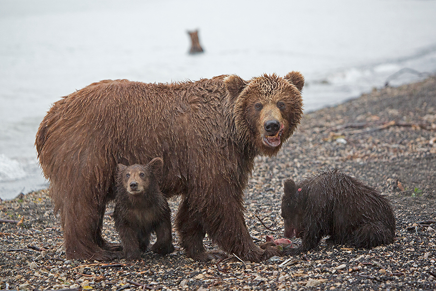 Всех медведей во время рыбалки можно условно разделить на три группы. Первая это мамы с детенышами. Они, как правило, рыбачат с берега ловя подходящую к устью ручьев рыбу.