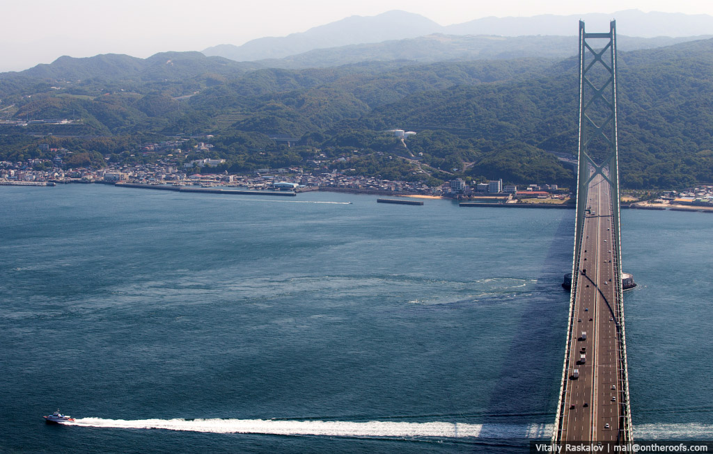 Четырнадцать лет назад, после целого десятилетия строительства, был завершён висячий мост Акаши-Кайкё, берущий своё начало в городе Кобе и ведущий через морской пролив на соседний остров. Долгие годы мост занимал первое место в мире по высоте и длине, среди мостов такого типа. Длина моста составляет 3911 метр, то есть почти четыре километра, при длине пролёта между пилонами в 1991 метр.