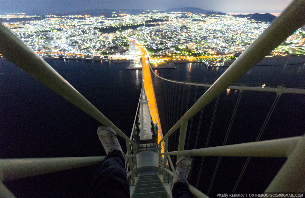 Когда в очередной раз меня спросят, где сложнее всего лазить. Я с уверенностью смогу ответить, что в Японии. Но, даже не смотря на хитроумные системы охраны и огромное количество камер на объектах, нам все-таки удалось забраться на один из самых значимых объектов страны. Самый высокий и большой подвесной мост в мире. Акаси-Кайкё в Осаке. Высота пилонов 300 метров. Это 4-й по высоте мост в мире.