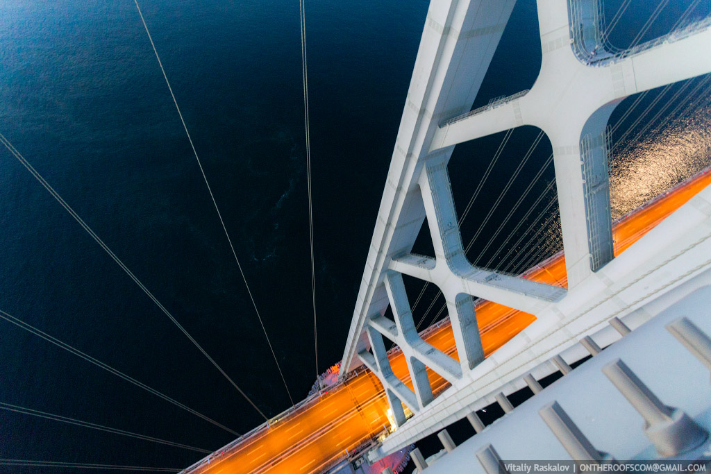 Наверху моста мы забирались под покровом ночью по тросам до верхушки пилона. Путь наверх занял, чуть меньше 30 минут. Самое сложно было, это адекватно оценить обстановку и наличие камер по периметру моста. Прежде чем лезть, мы провели разведку территории, выучили местоположений камер и нашли удобный пролаз к вантам в обход всех систем безопасности.