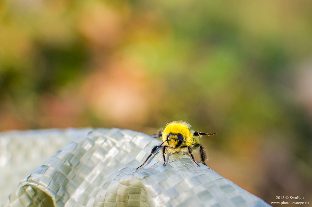 Этот шмель всю ночь летал, грелся с нами у костра, днём сел на мусорный мешок да так на нём и сидел до вечера.