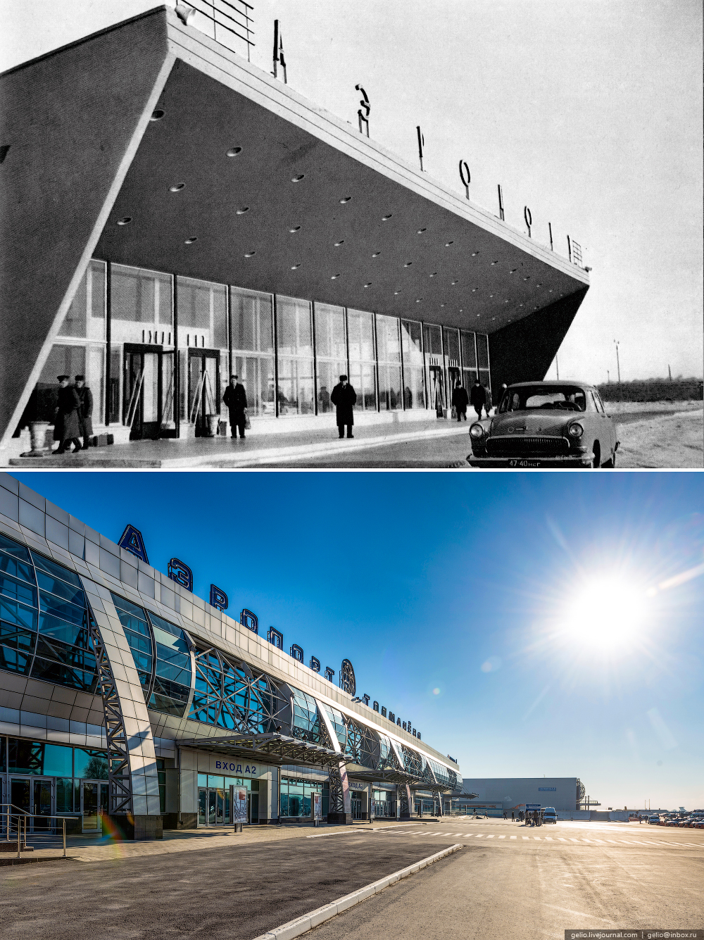 Официальной датой рождения аэропорта Толмачево считается 17.01.1955, а 22.02.1955 на военную полосу аэропорта приземлился первый почтовый реактивный самолёт Ил-28, доставивший из Москвы в Новосибирск матрицы центральных газет. 22.11.1956 в Толмачёво впервые приземлился реактивный самолёт Ту-104. А днём рождения пассажирского аэропорта считается 12 июля 1957, когда был выполнен первый пассажирский рейс № 020 Новосибирск — Москва с промежуточной посадкой в Свердловске. Самолёт Ту-104 доставил в столицу 50 пассажиров. Командиром воздушного судна был В. М. Купало. 21 ноября 1963 года было принято в эксплуатацию новое здание аэровокзала по проекту архитектора А. А. Воловика общей площадью помещений 10 254,4 м2 с пропускной способностью 1000 пассажиров в час. Более 30 лет трёхэтажное здание с красным козырьком было визитной карточкой главного аэропорта Сибири.