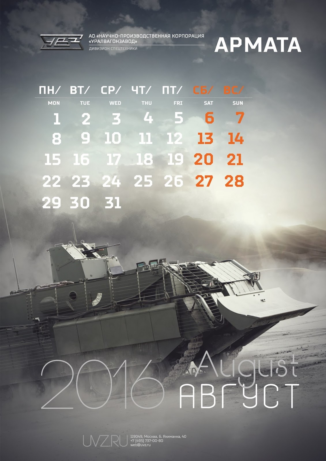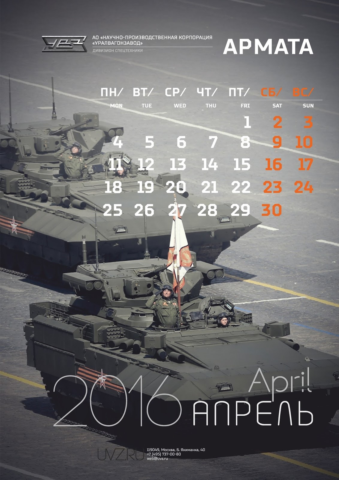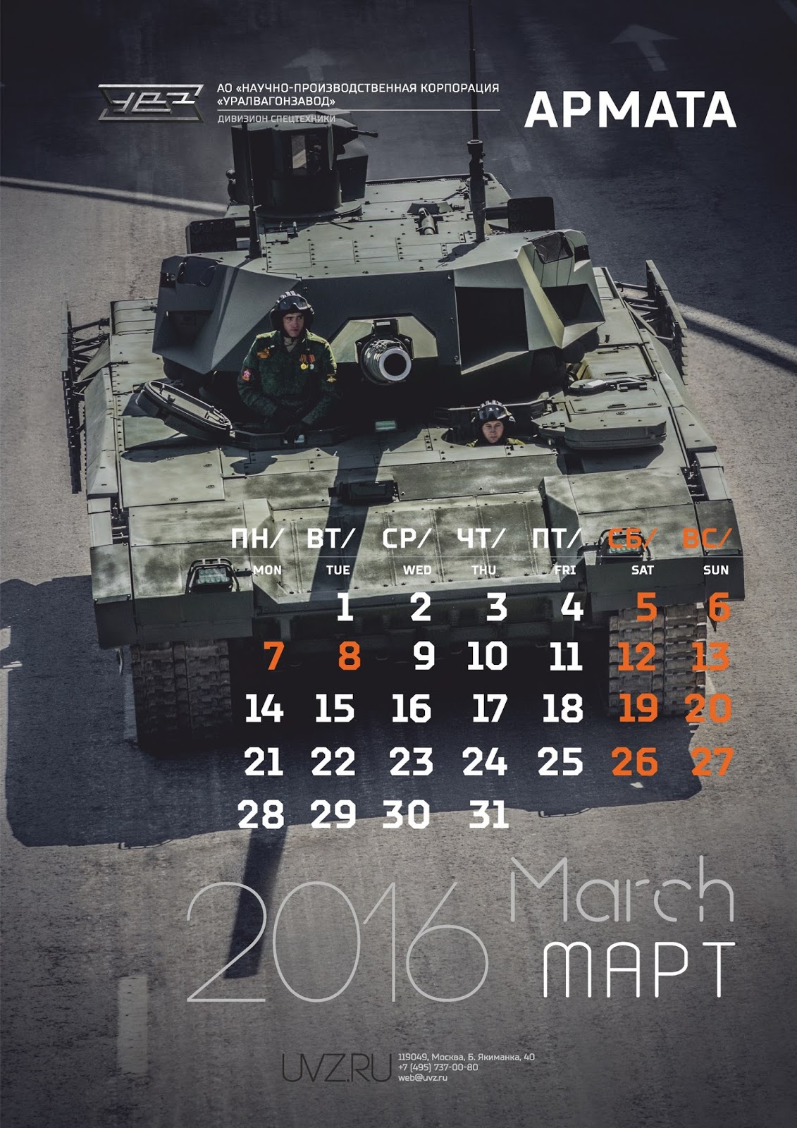 На официальном сайте АО "Уралвагонзавод" (УВЗ) был выложен в открытый доступ календарь на 2016 год с уникальными фотографиями танка Армата.