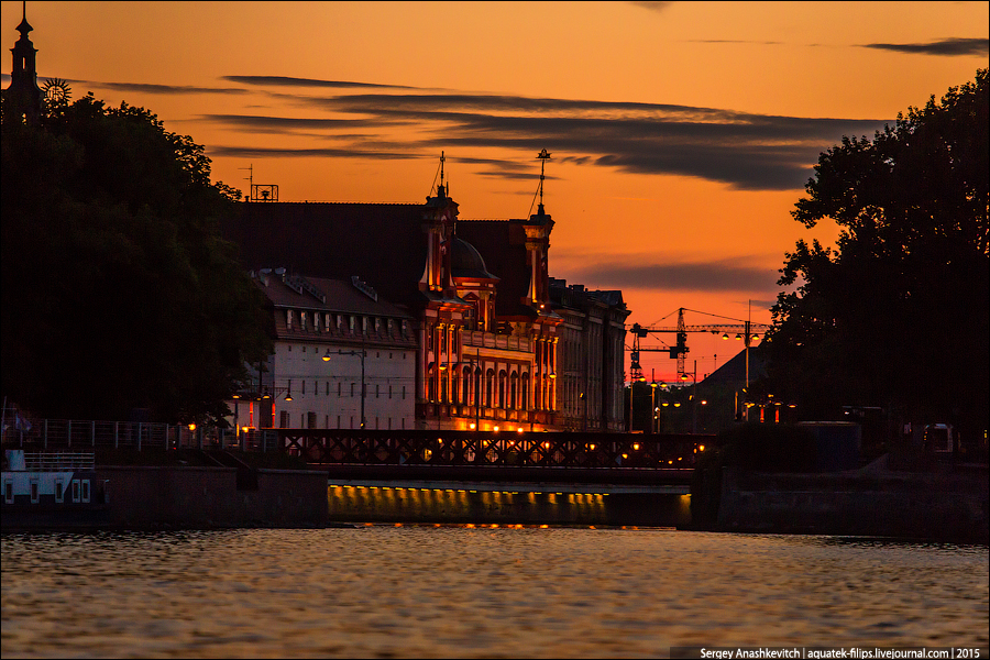 Очень рекомендую прокатиться на закате на лодке или кораблике по Одеру. С воды Вроцлав, погружающийся в темноту, выглядит особенно красиво