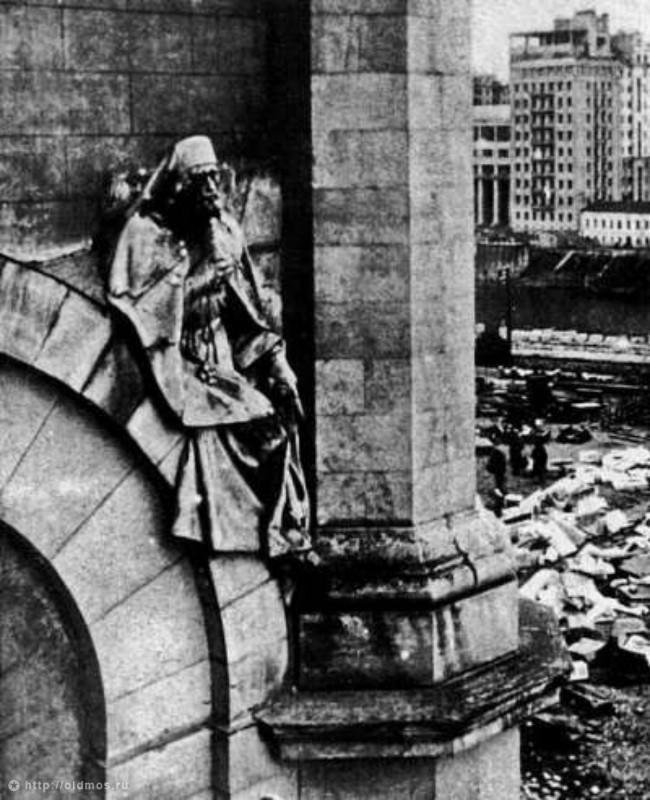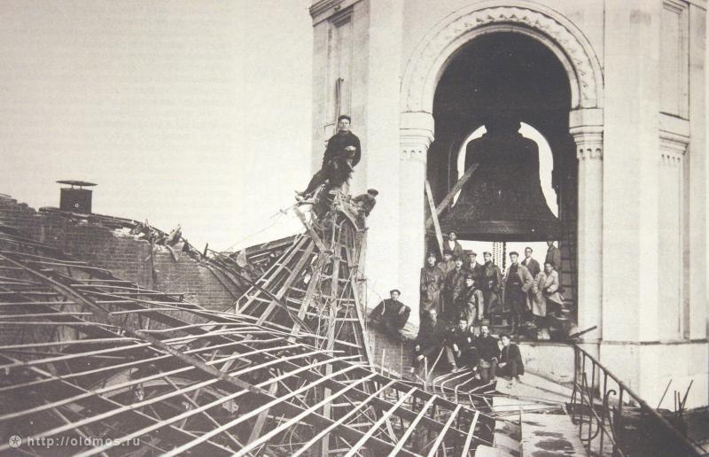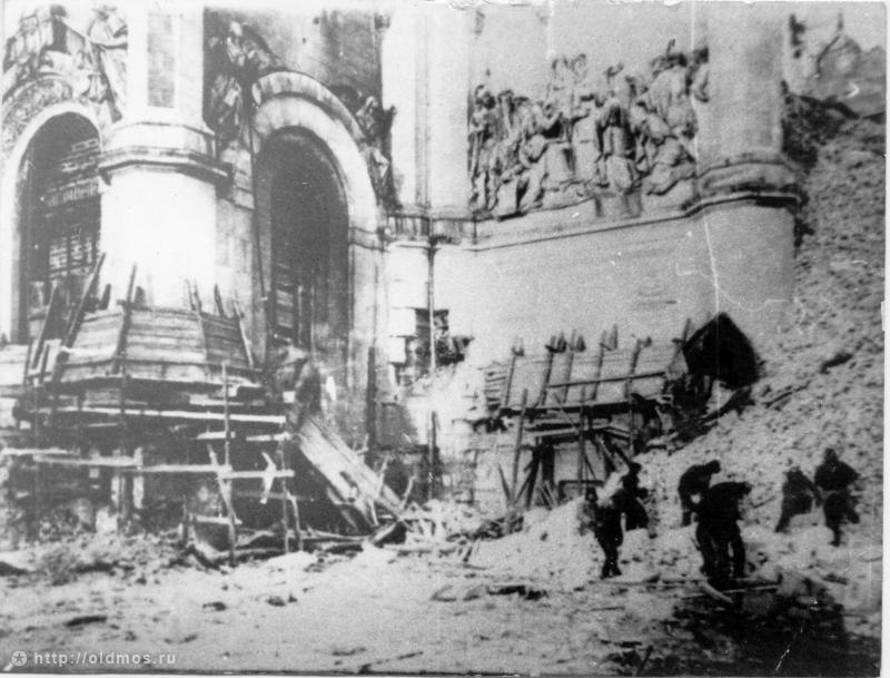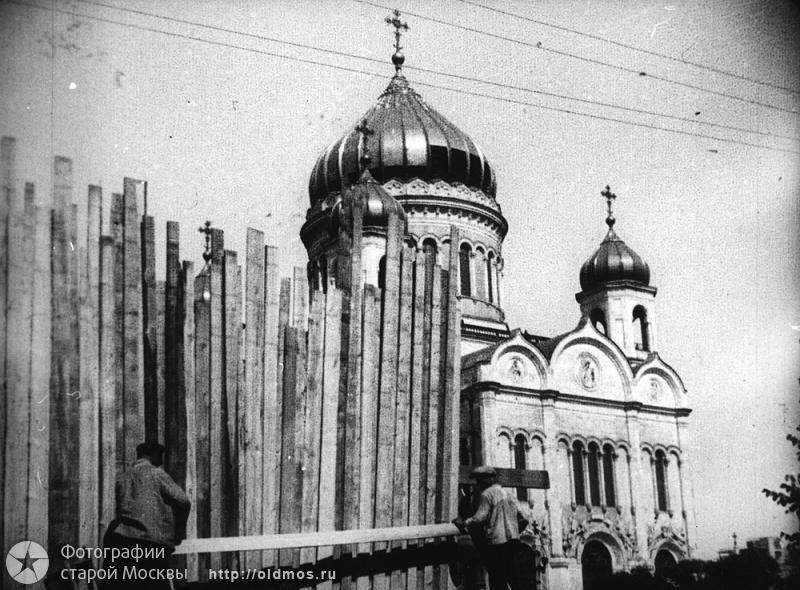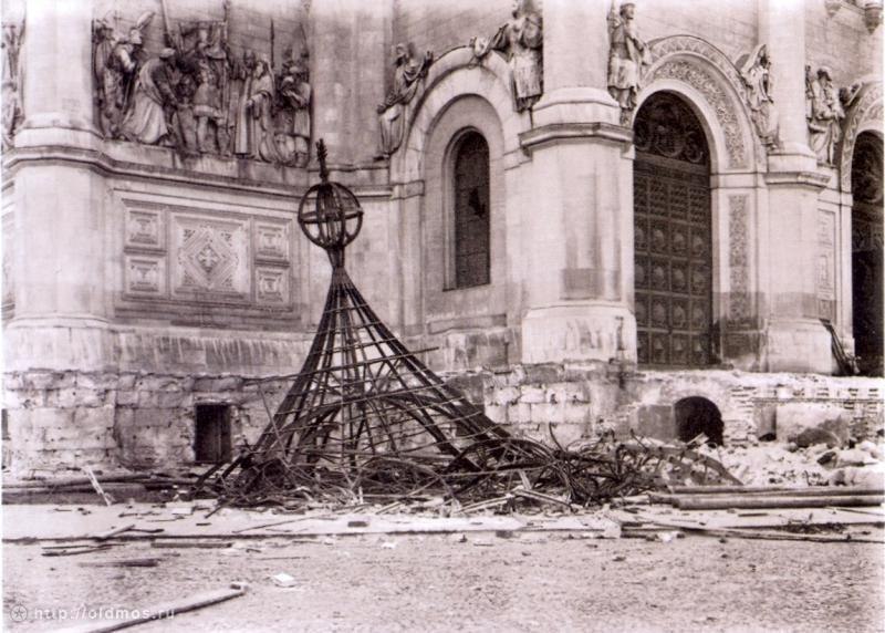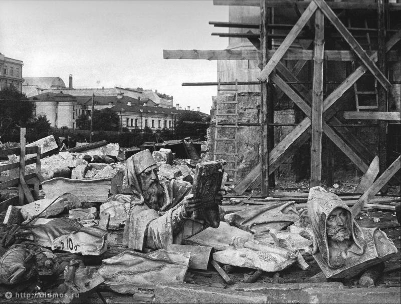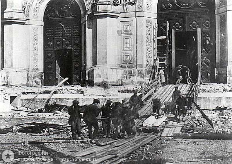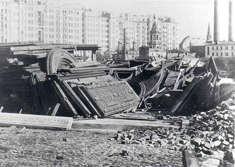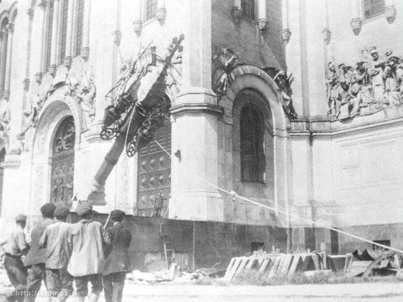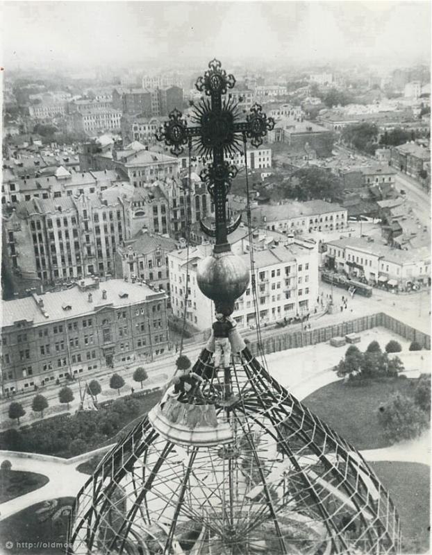 18 августа 1931 года, ровно через месяц после публикации в "Известиях" постановления о конкурсе на Дворец Советов, на месте Храма Христа Спасителя начались работы по его разборке. Территорию, прилегающую к Храму, обнесли забором. Осенью 1931 года разборка здания шла уже полным ходом, причем снаружи и внутри одновременно. Работы проводились в большой спешке: листы обшивки крыши и куполов сбрасывались вниз, разбивая облицовку и скульптуры. Сброшенный с Храма крест не упал вниз, а застрял в арматуре купола (видимо, тогда и был сделан снимок, размещенный здесь). Красавец-Храм умирал на глазах у всей Москвы и России.