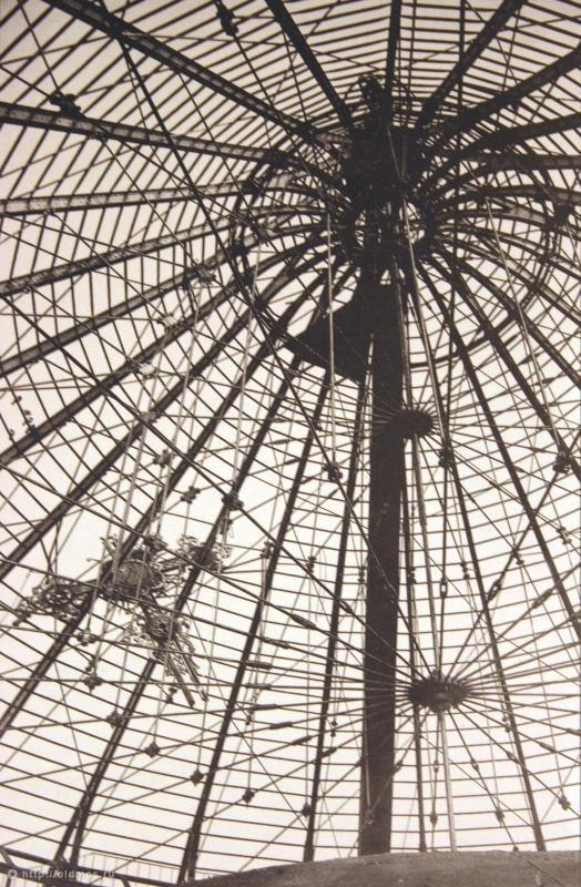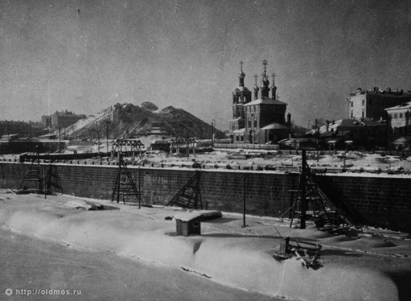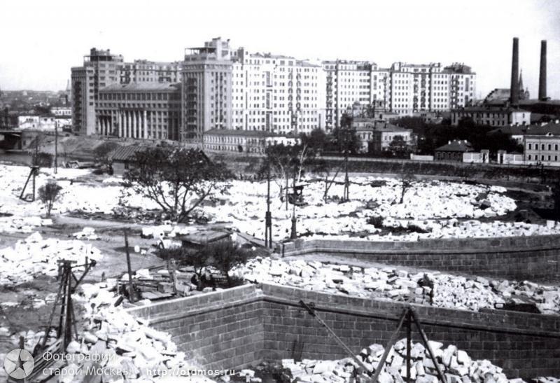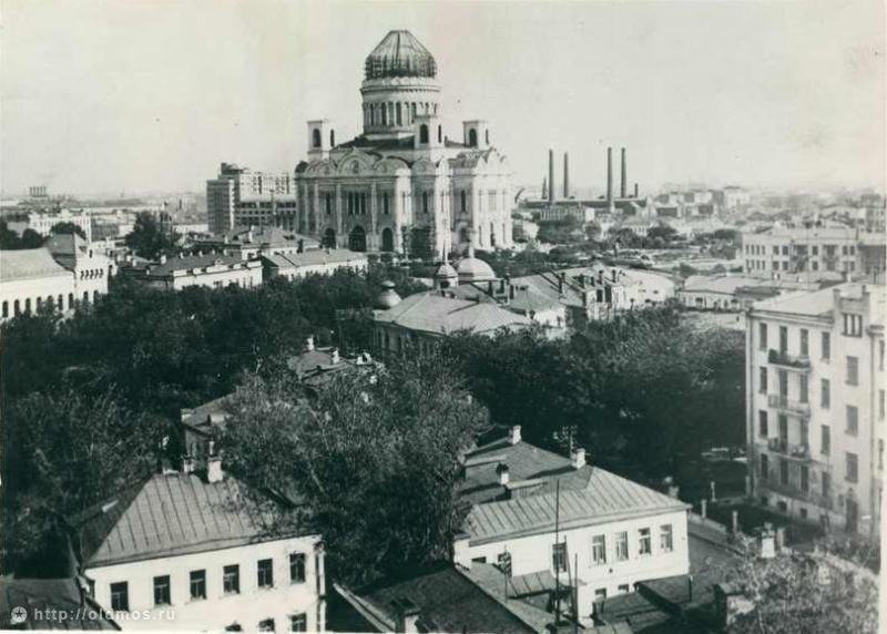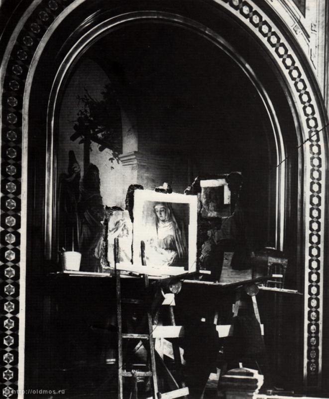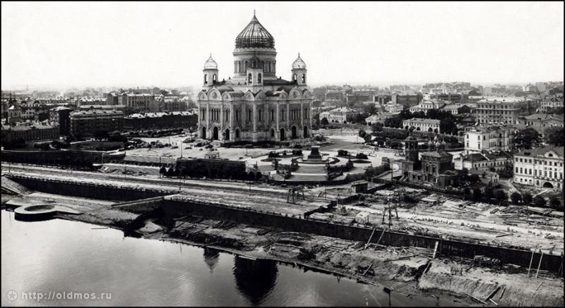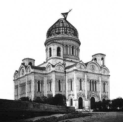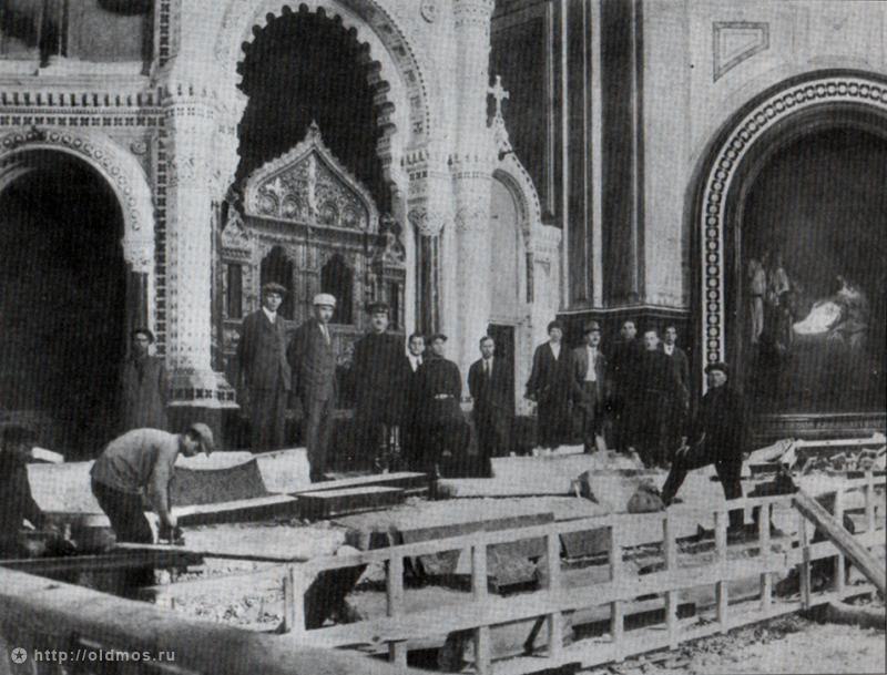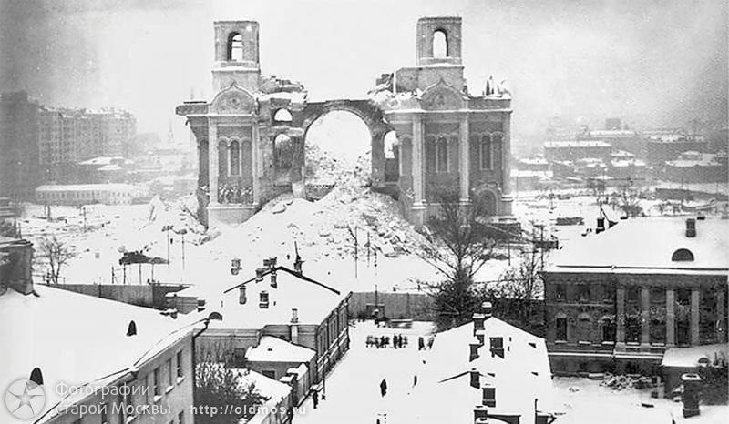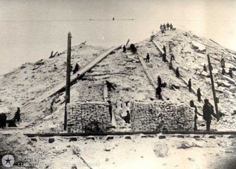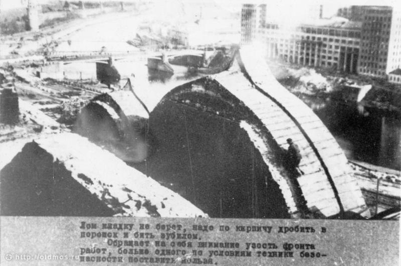 18 августа 1931 года, ровно через месяц после публикации в "Известиях" постановления о конкурсе на Дворец Советов, на месте Храма Христа Спасителя начались работы по его разборке. Территорию, прилегающую к Храму, обнесли забором. Осенью 1931 года разборка здания шла уже полным ходом, причем снаружи и внутри одновременно. Работы проводились в большой спешке: листы обшивки крыши и куполов сбрасывались вниз, разбивая облицовку и скульптуры. Сброшенный с Храма крест не упал вниз, а застрял в арматуре купола (видимо, тогда и был сделан снимок, размещенный здесь). Красавец-Храм умирал на глазах у всей Москвы и России.