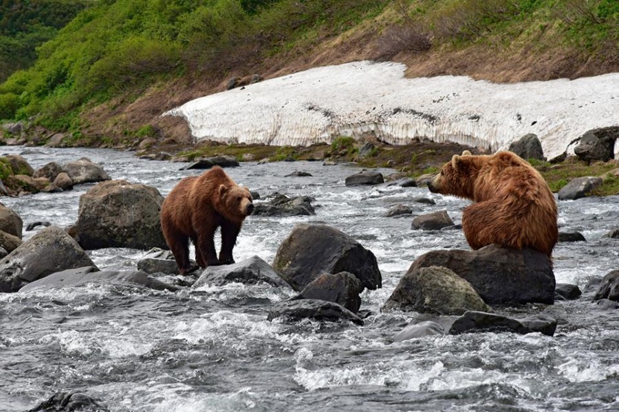 В этой фотографии - момент беседы юного и взрослого медведей. Молодому кажется, что вся рыба скапливается у камня, на котором разместился второй мишка. Немного задиристо он, наверное, просит уступить площадку. Но встречает отпор.