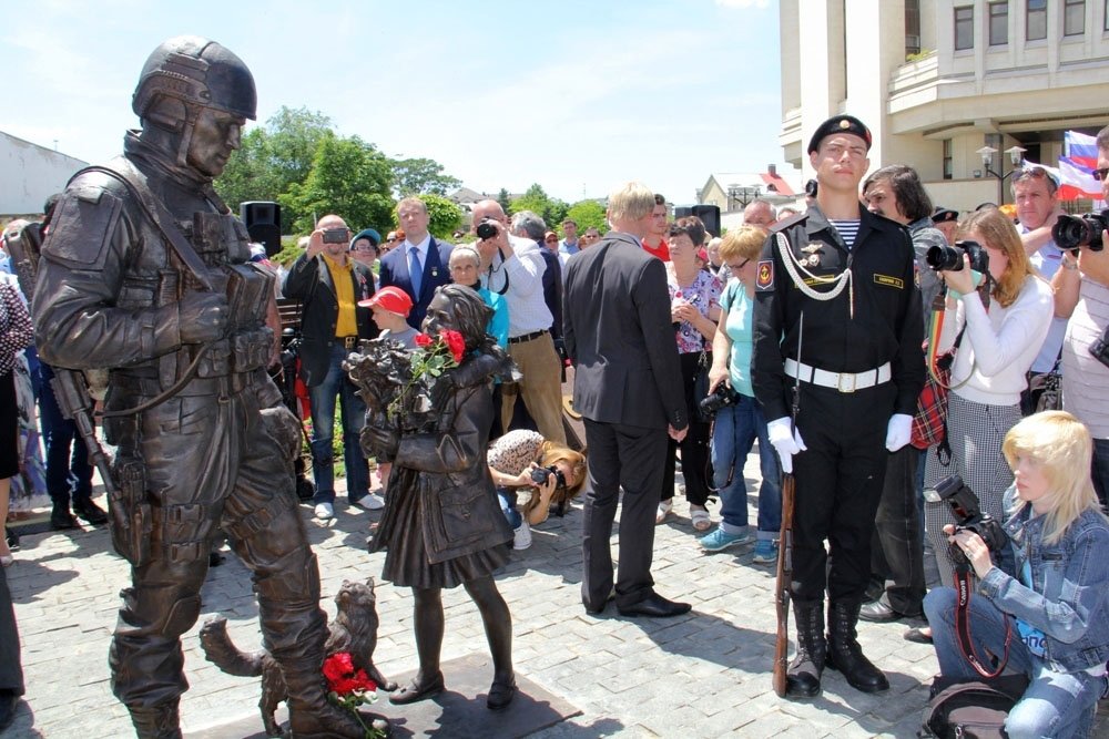 Присутствующий на церемонии глава Крыма Сергей Аксенов поздравил всех с Днем России и отметил в приветствии, что памятник сделан с одного из военнослужащих, непосредственно принимавших участие в Крымской весне.