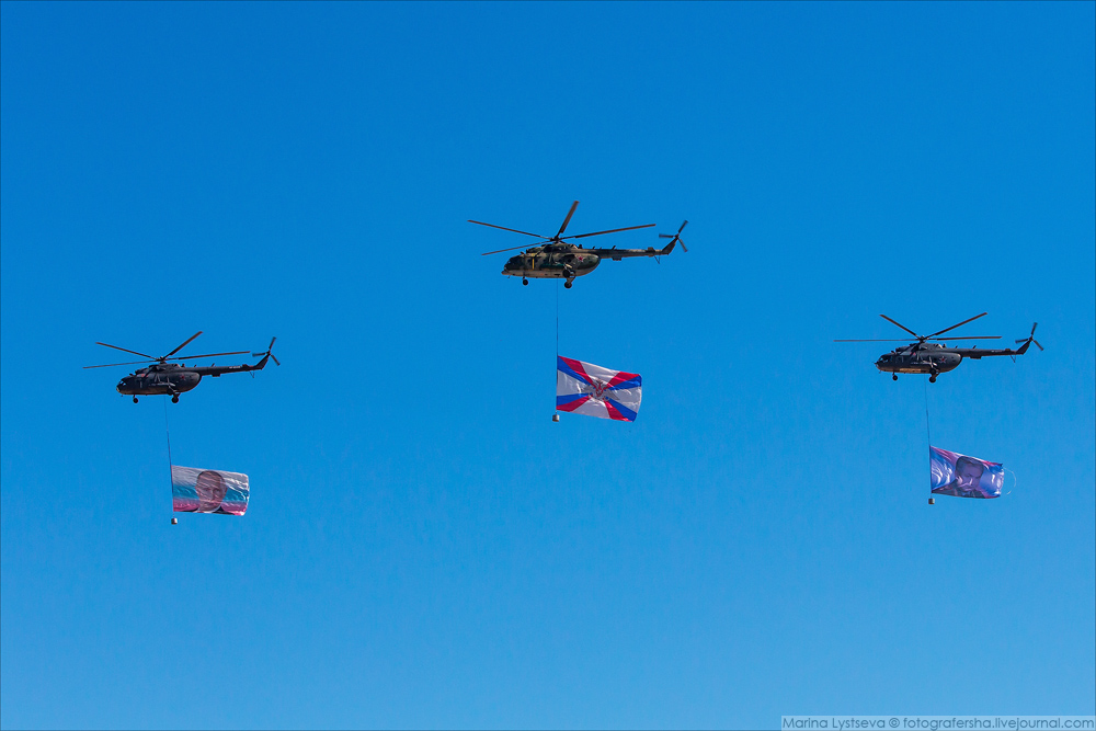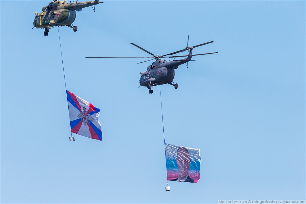 После речей прошли вертолеты Ми-8 с необычными флагами.