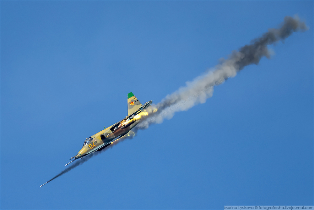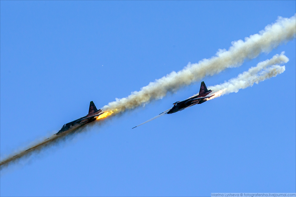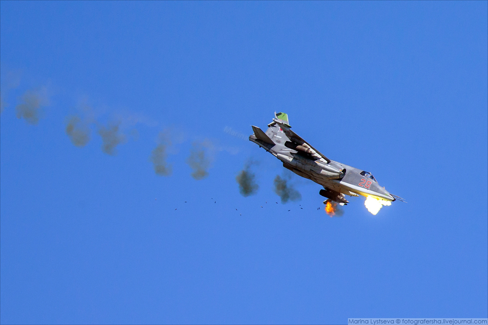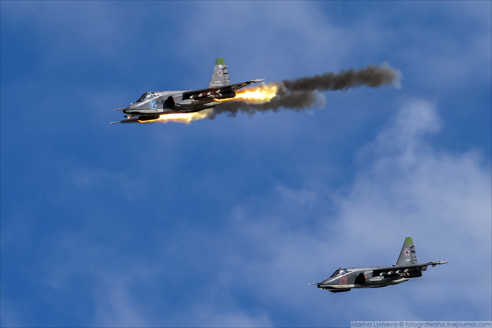 СУ-25 соревновались на групповую слетанность по маршруту, визуальную воздушную разведку и в зону на простой пилотаж на малых высотах.