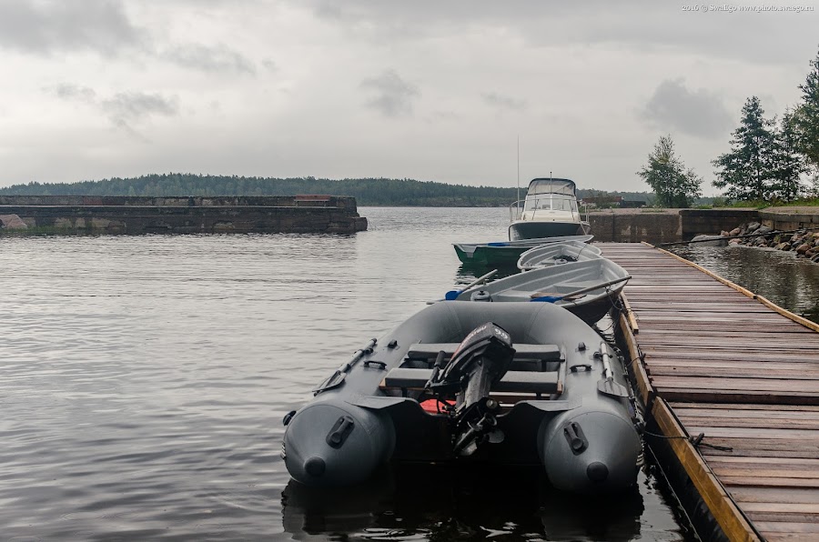 К обеду с нами приключилась интересная история. Вообщем поехали с эхолотом рыбу искать. Смотрю вдалеке на острове кто-то машет жилетом оранжевым. А к слову, в бухтах вода спокойная, а на открытых участках метровые волны, да и дождь с ветром. Поехали посмотреть что за человек зовёт. Оказалось, турист-одиночка вчера по штилю на дурацкой прокатной лодке, на вёслах, приплыл на острова, уже у открытой Ладоги. А поутру уплыть не смог, у берега такие волны, что его, в лучшем случае просто выкинуло бы обратно, в худшем перевернуло бы лодку и разбило о камни. Вообщем труба чуваку. Хорошо что мы его увидели. Спасательная операция длилась больше часа. Мы с мотором не могли причалить. Кое-как получилось. Перетащили его шмотки к нам, лодку привязали, и буксиром пригнали его на турбазу, час ходу, если не больше. Как говорил Паша (так парня звали), еды у него хватило бы на пару дней, "оптимизма" внушали таблички на камнях с именами погибших рыбаков, и прогноз погоды, который ещё несколько дней ничего хорошего не обещал. К тому же ему жилет выдали, ну как жилет, просто оранжевая безрукавка, абсолютно бесполезная вещь, только махать ей если только.