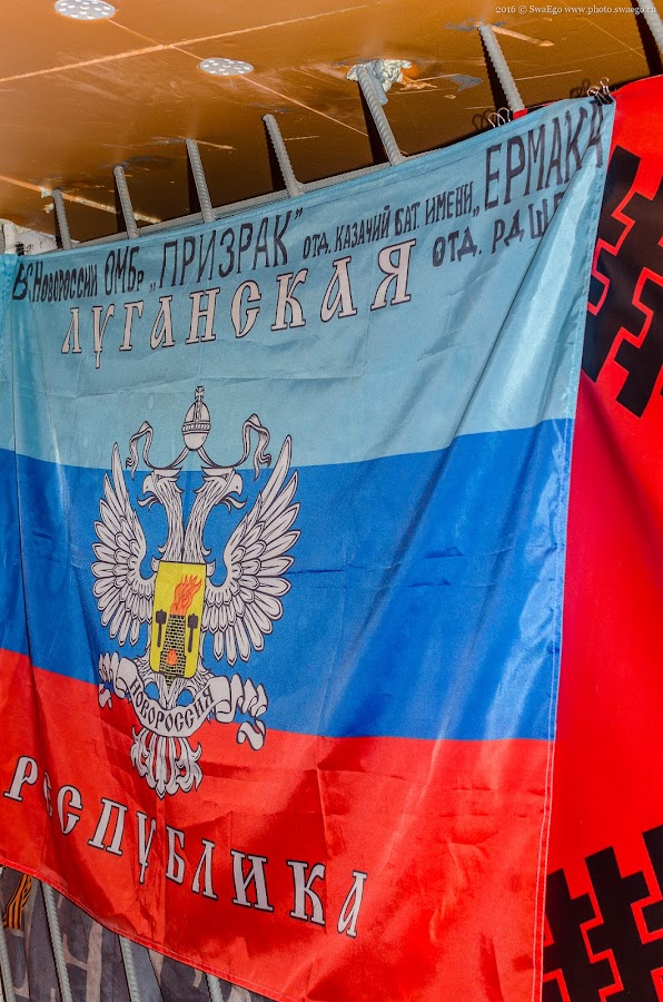 Это стяг бригады "Призрак". Алексей Борисович Мозговой был одним из первых, кто в Луганской области Украины сказал своё слово, и это слово было "НЕТ! хунте!". Затем он собрал единомышленников. Неприятие незаконно выбранной власти вылилось в гражданскую войну.