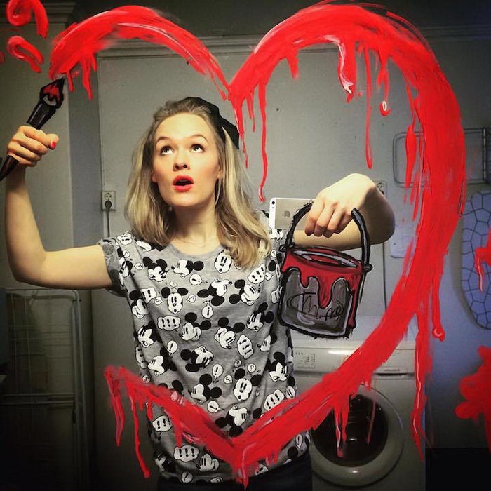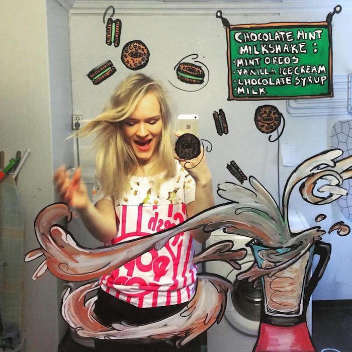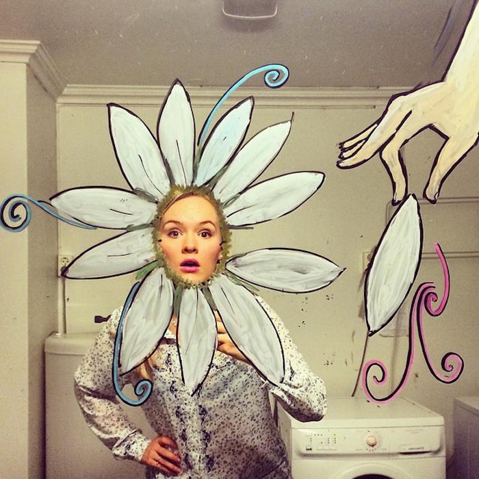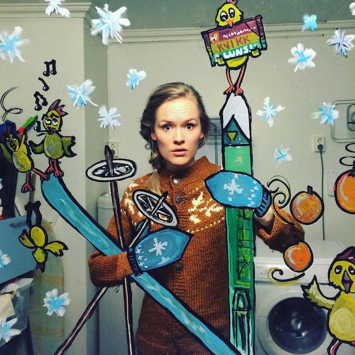 Хелен Мелдал (Helene Meldahl) с помощью красок разрисовывает зеркало в своей ванной комнате, чтобы затем сфотографироваться в свежих декорациях. Работы Хелен можно найти в ее инстаграм-аккаунте @mirrorsme.