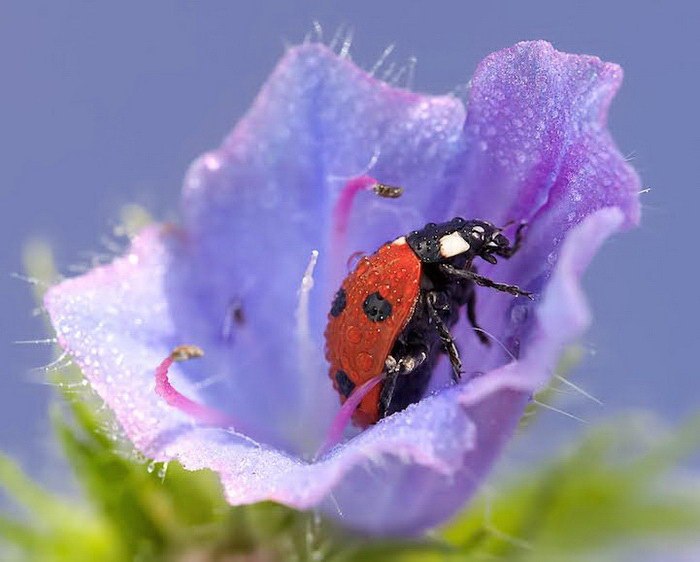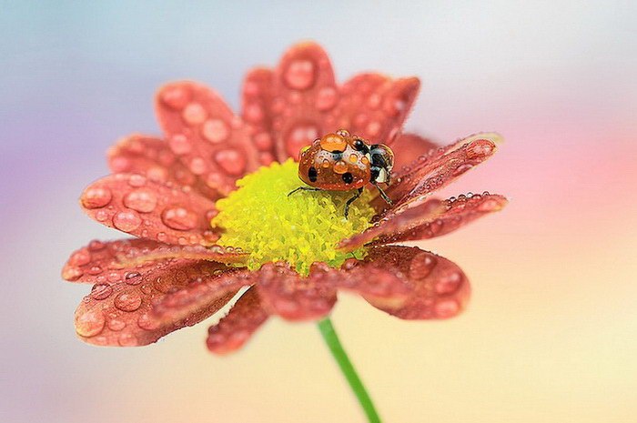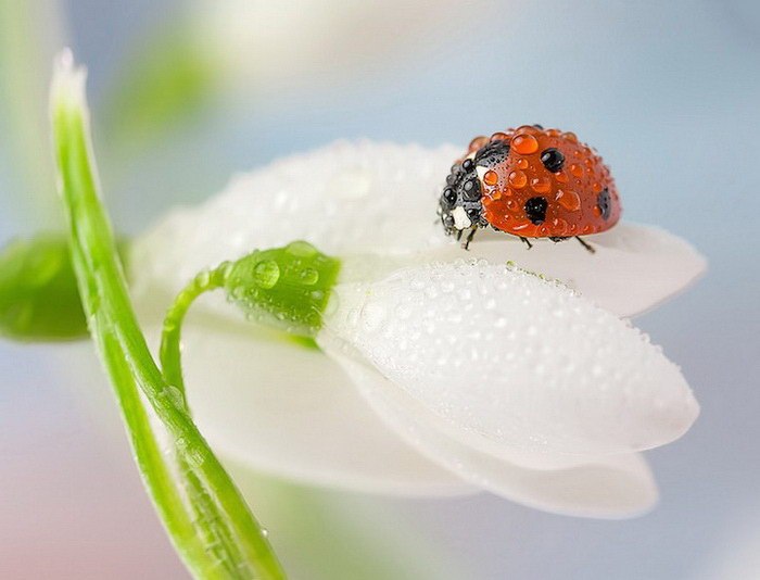Ирландский фотограф Томас Скоцен (Tomasz Skoczen) запечатлел божьих коровок на листках и веточках в утренней росе. Все фотографии сделаны фотоаппаратом Canon 5D Mark II с макро-объективом.
