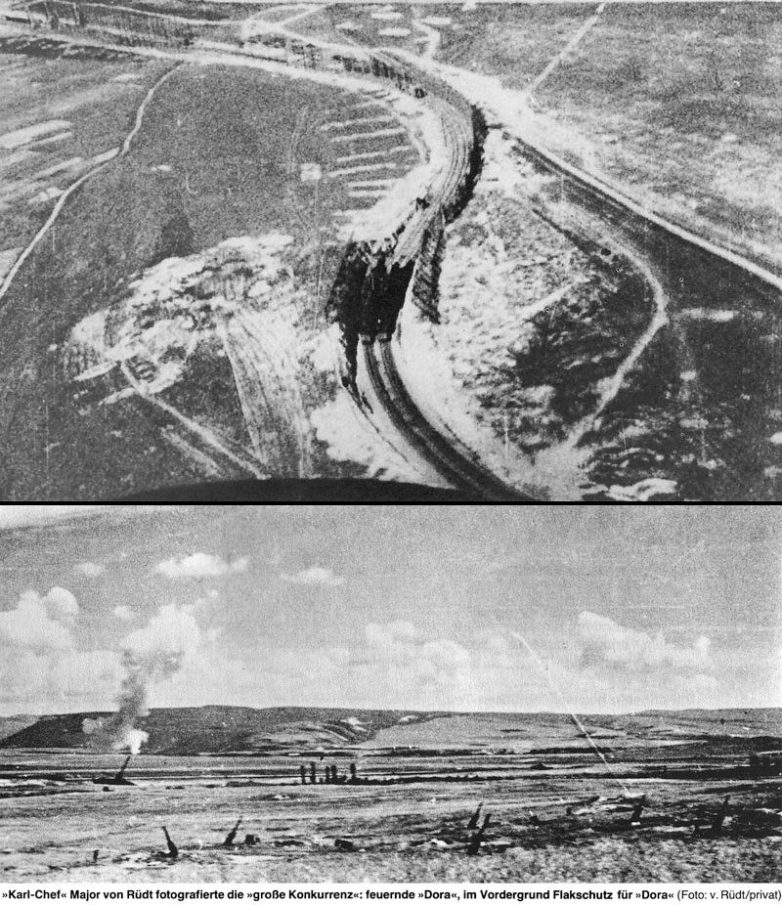 Немецкое сверхтяжелое орудие «Дора» (калибр 800 мм, вес 1350 тонн) на позиции под Бахчисараем. Орудие использовалось при штурме Севастополя для разрушения оборонительных укреплений, но из-за удаленности (минимальная дальность стрельбы — 25 км) позиции от целей огонь был неэффективным. При 44 выстрелах семитонными снарядами было зафиксировано лишь одно удачное попадание, вызвавшее взрыв склада боеприпасов на северном берегу бухты Северной, находившегося на глубине 27 м.