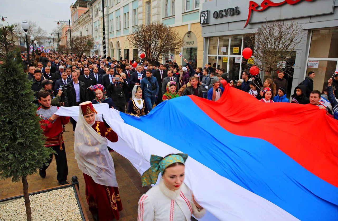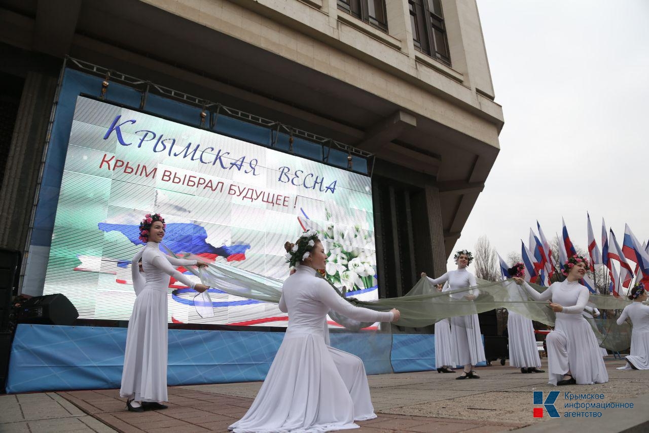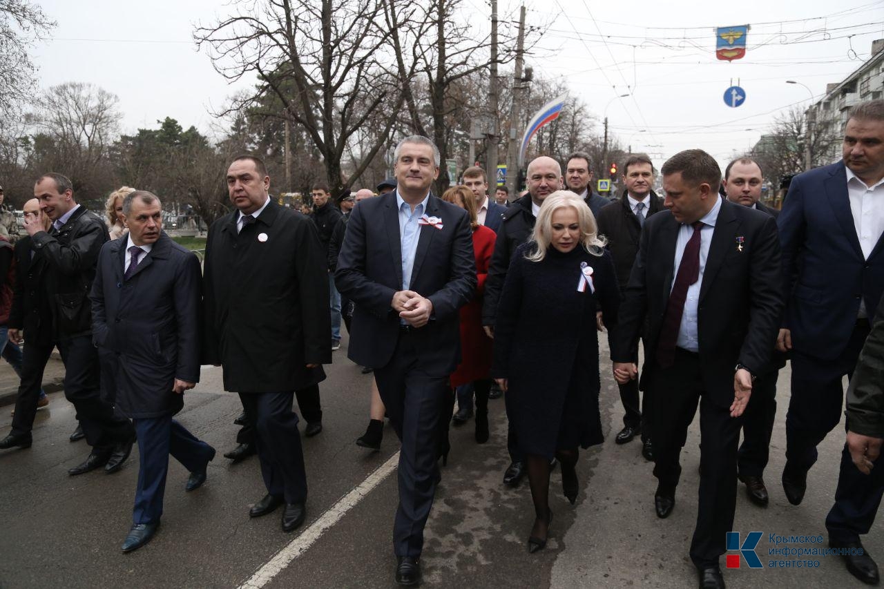 16 марта в центре Симферополя День воссоединения Крыма с Россией отпраздновали праздничным шествием с цветами в руках и криками «Ура! Мы вернулись домой!». Как сообщает корреспондент КИА (Крымское информационное агенство), праздничную колонну возглавил глава Крыма Сергей Аксенов вместе с председателем Государственного Совета РК Владимиром Константиновым и главами ДНР и ЛНР Владимиром Захарченко и Игорем Плотницким.