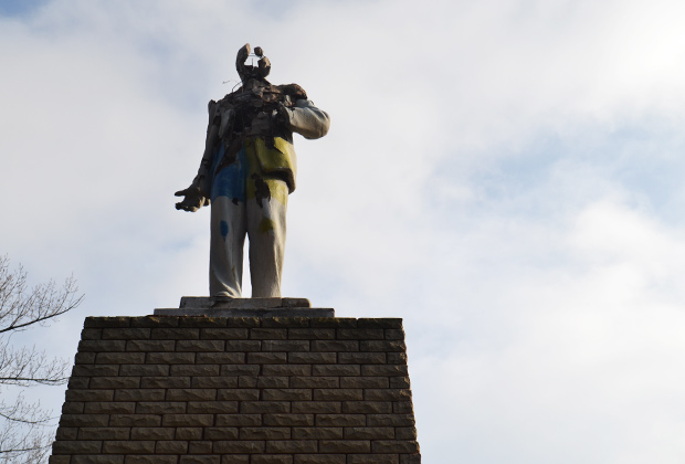 Мы побывали у здания заводского дома культуры, где колоннада поддерживала несуществующую крышу. Здесь я сфотографировал памятник Ленину, расстрелянный в День всех влюбленных. У вождя мирового пролетариата была насквозь прострелена голова, а на теле, изрытом пулевыми оспинами, виднелись следы сине-желтой краски. Затем я осмотрел сожженный городской рынок. На самой его окраине еще теплилась какая-то жизнь. Несколько человек торговали нехитрым товаром - бытовыми мелочами и одеждой. Вообще город выглядел довольно безлюдным, хотя, по словам Валерия, по окончании активной фазы боевых действий многие беженцы вернулись домой.