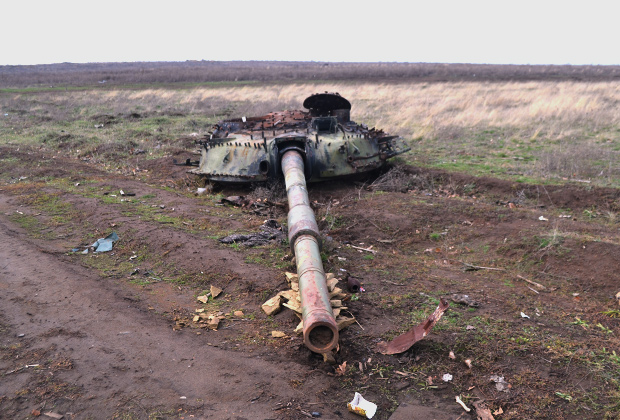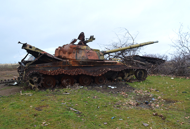 В воздухе раздавались резкие хлопки, пока я осматривал два сожженных украинских танка на границе городка. У одной боевой машины была сорвана башня. Она лежала тут же, в нескольких метрах. Чуть подальше обнаружился БМП. Тоже сожженный, покрытый потеками ржавчины и также без башни, которую найти уже не удалось. По словам Валерия, башню приспособили для каких-то загадочных нужд горожане.