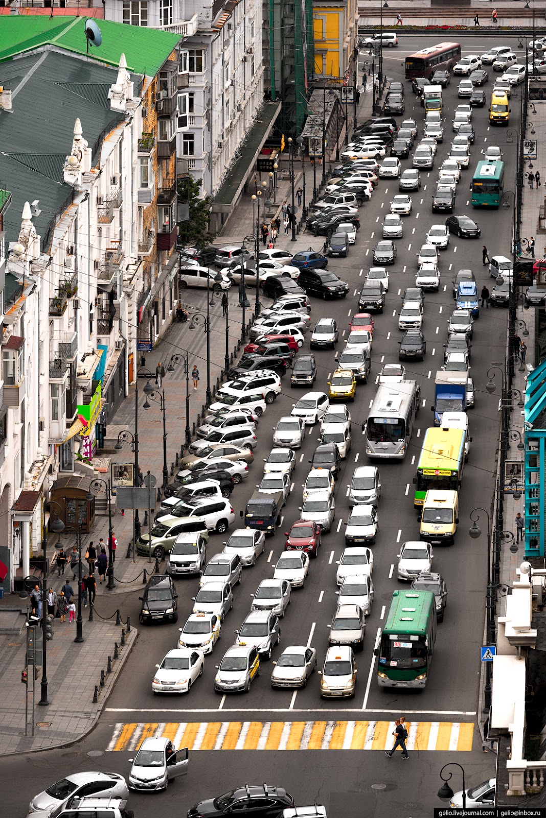 Автомобильные пробки — настоящий бич города, проектировка которого не рассчитана на огромное количество автомашин. Владивосток, получивший после краха СССР доступ к рынку б/у японских автомашин, сегодня самый автомобилизированный город России. По размеру автопарка он уступает только обеим столицам, а также Новосибирску и Екатеринбургу, хотя по количеству населения в разы меньше этих мегаполисов.