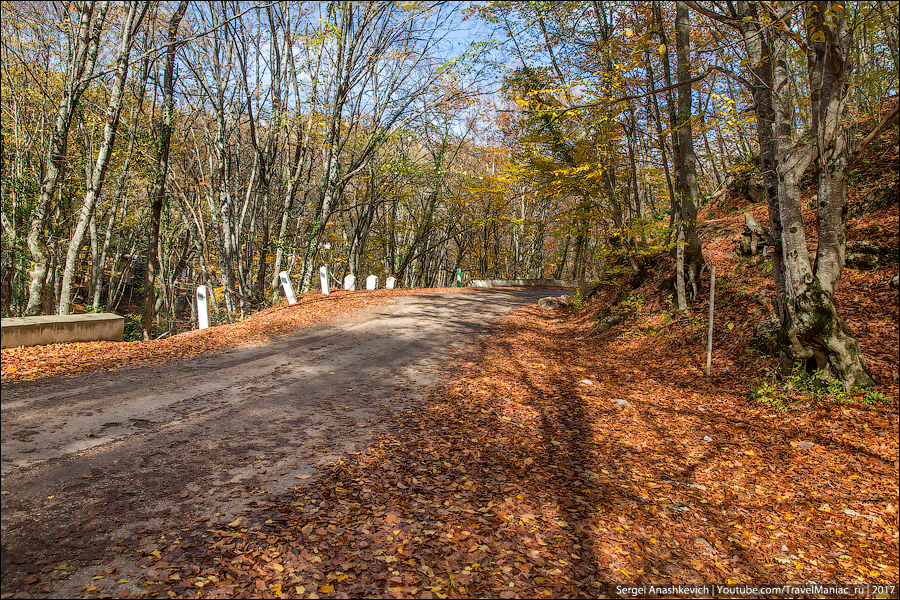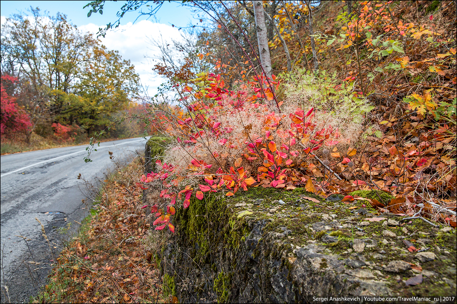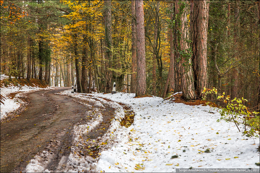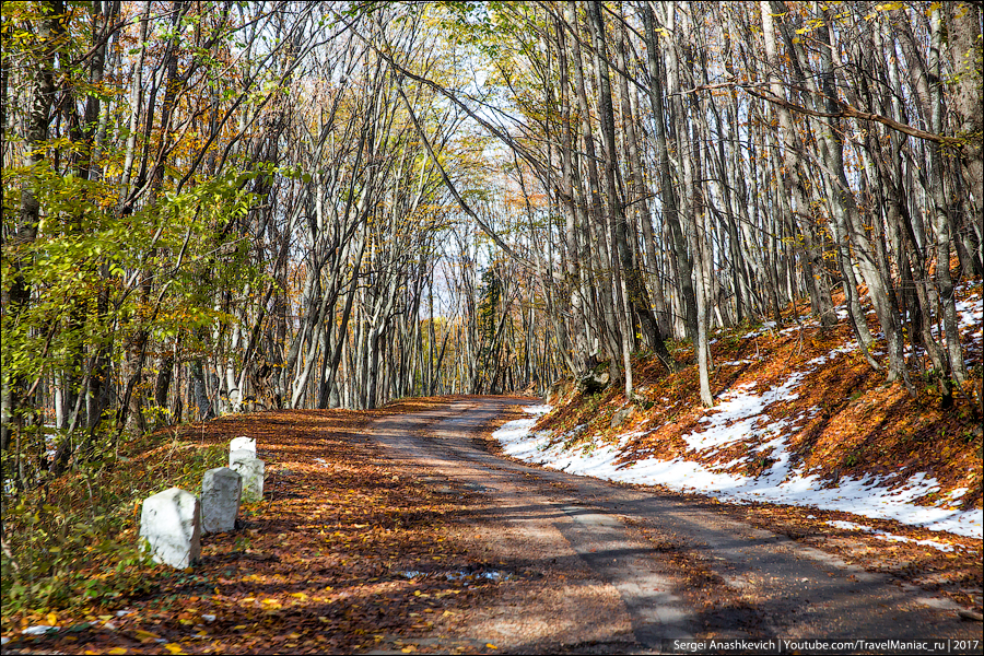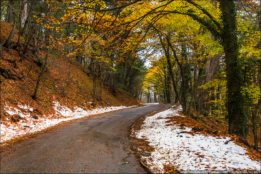 В один день вы можете увидеть и еще вовсе не тронутую осенью зелень виноградников, и невероятное разноцветье лиственного леса в предгорьях, и почти осыпавшиеся буковые рощи и заснеженные дороги в горах, в которых беспомощно застряли машины.