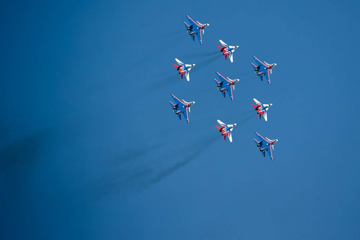 Прошло уникальное авиашоу с участием экипажей четырех авиационных групп высшего пилотажа (АГВП) Воздушно-космических сил -- "Русских витязей" на истребителях Су-30СМ, "Стрижей" на истребителях МиГ-29, "Соколов России" на истребителях Су-30СМ, "Беркутов" на ударных вертолетах Ми-28Н.
