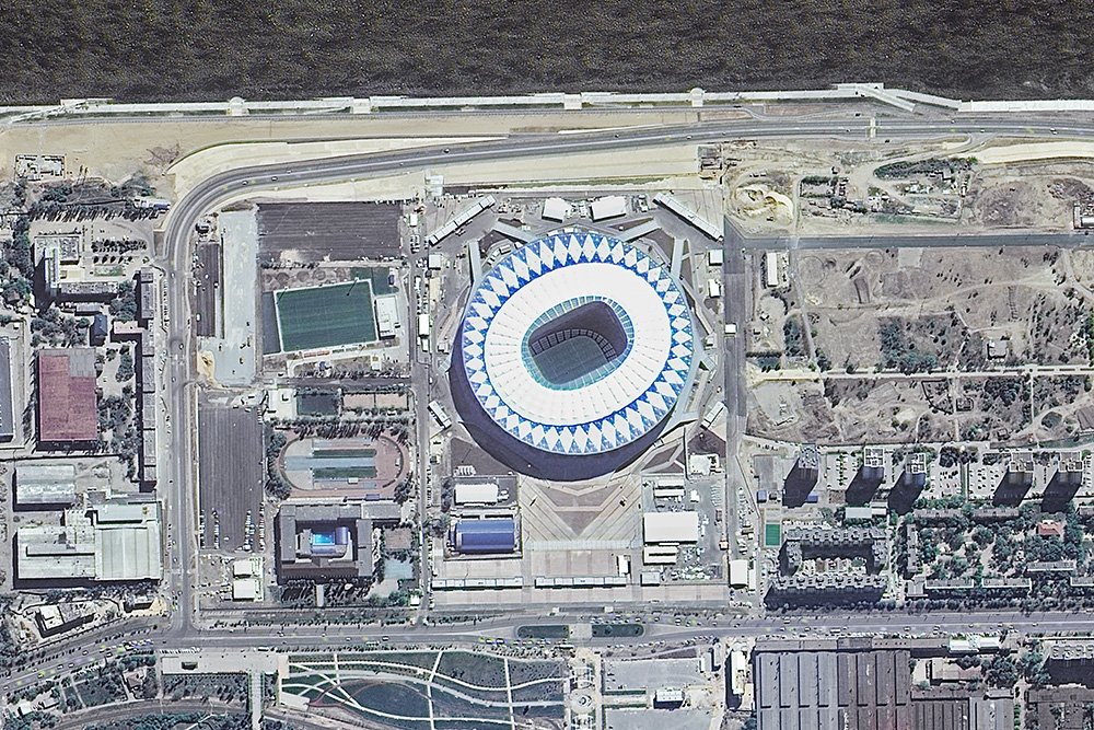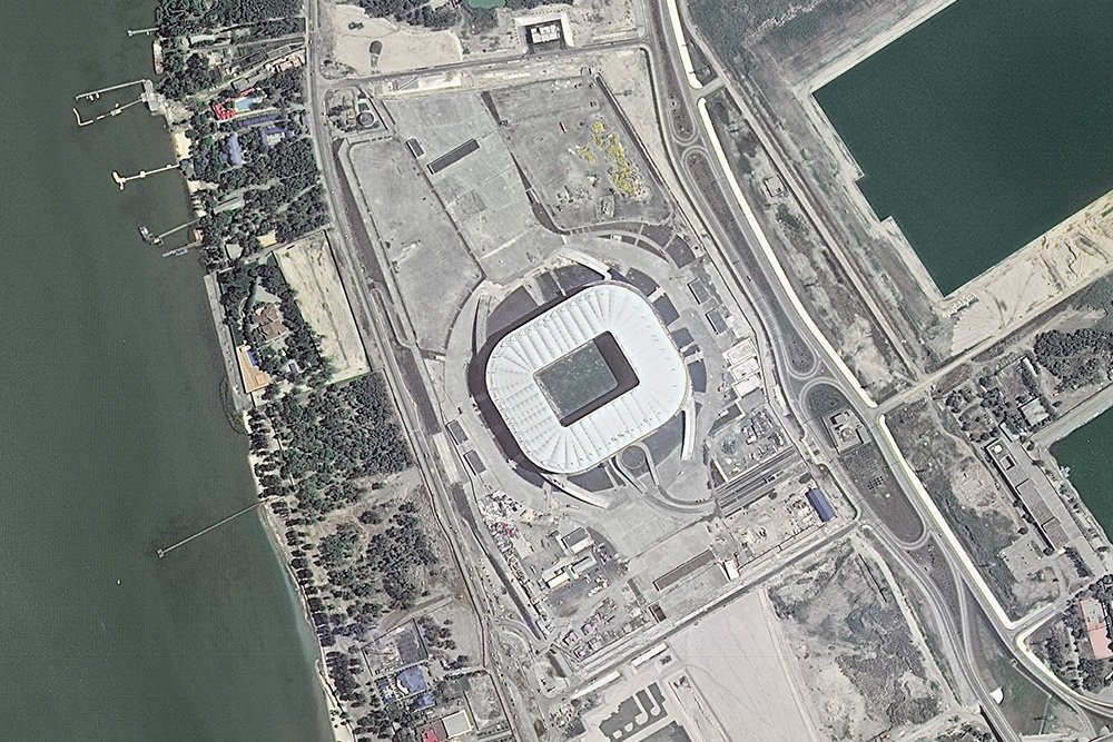 Фотографии стадионов, которые принимают матчи Чемпионата. Фотографии сделаны космическим аппаратом "Ресурс-П" с помощью аппаратуры "Геотон".