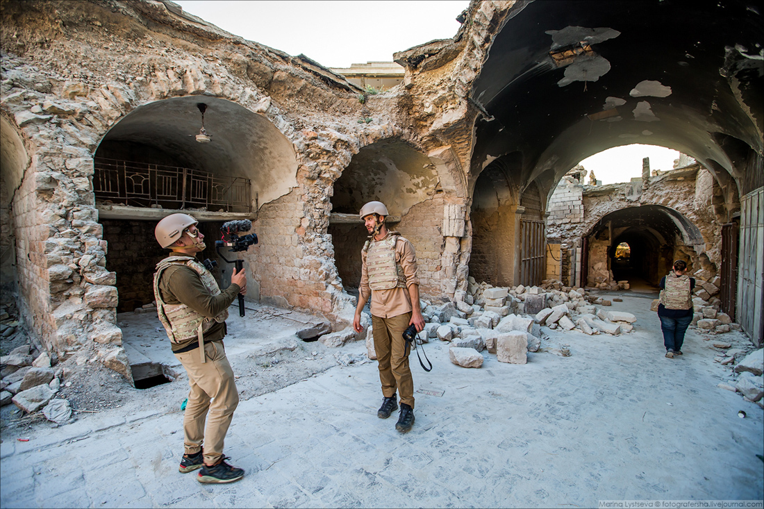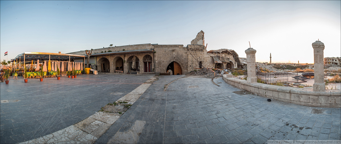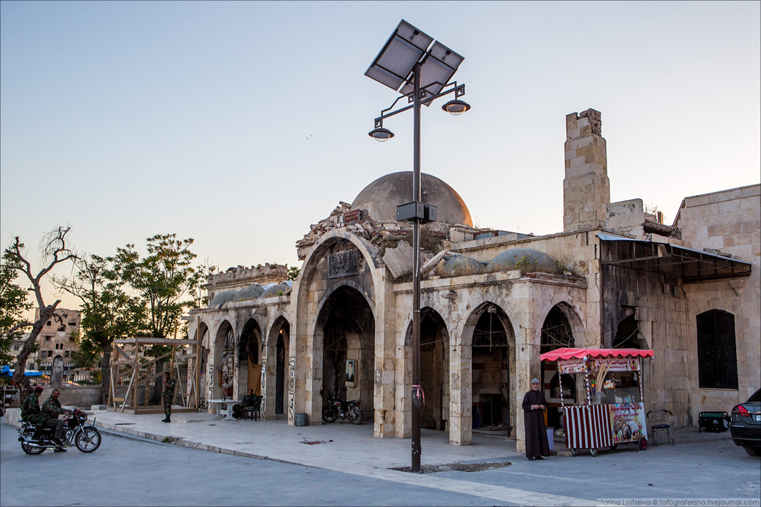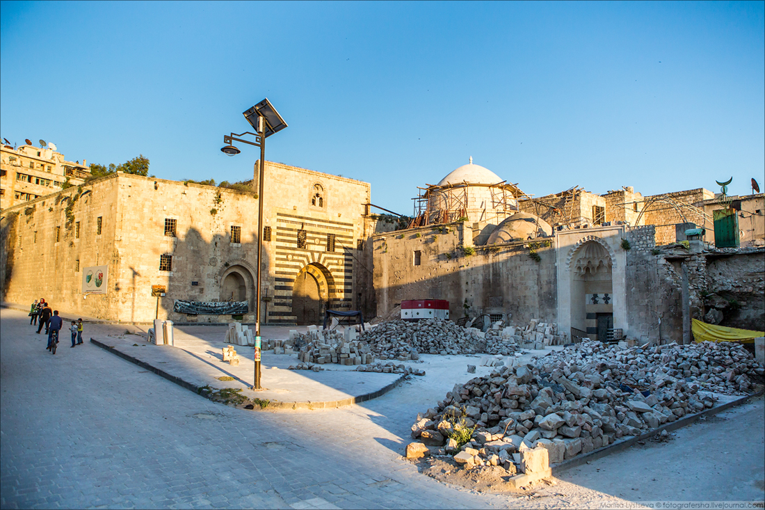 Слева здание Хан-аль-Вазир — самого крупного и известного караван-сарая в Алеппо, построенного в 1682 году.Справа восстанавливают мечеть Джами-аль-Фусток (1349 г.)