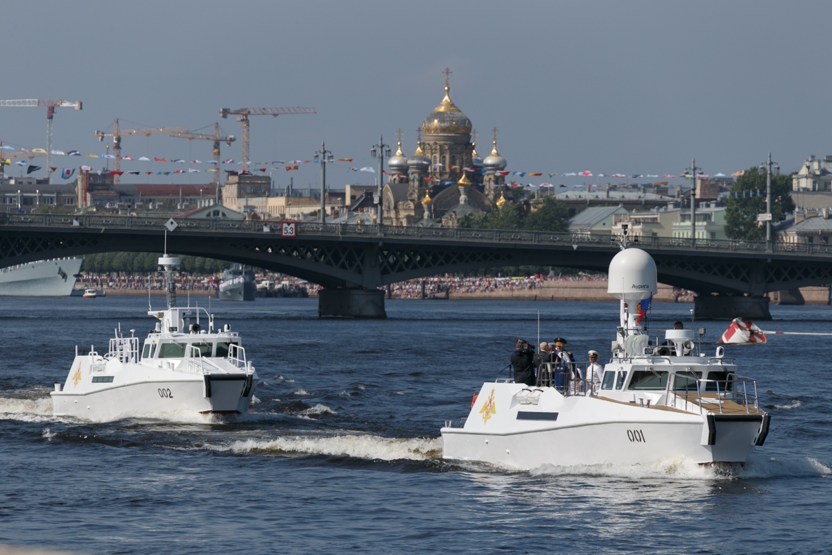 Парад исторической ретроспективы в акватории Невы открыл десантный катер с ботиком Петра 1 на борту. Продолжили историческую часть парада артиллерийские катера Каспийской флотилии с боевыми знаменами прославленных соединений морской пехоты, героически оборонявших и освобождавших в годы Великой Отечественной войны города Ленинград, Севастополь и Новороссийск.