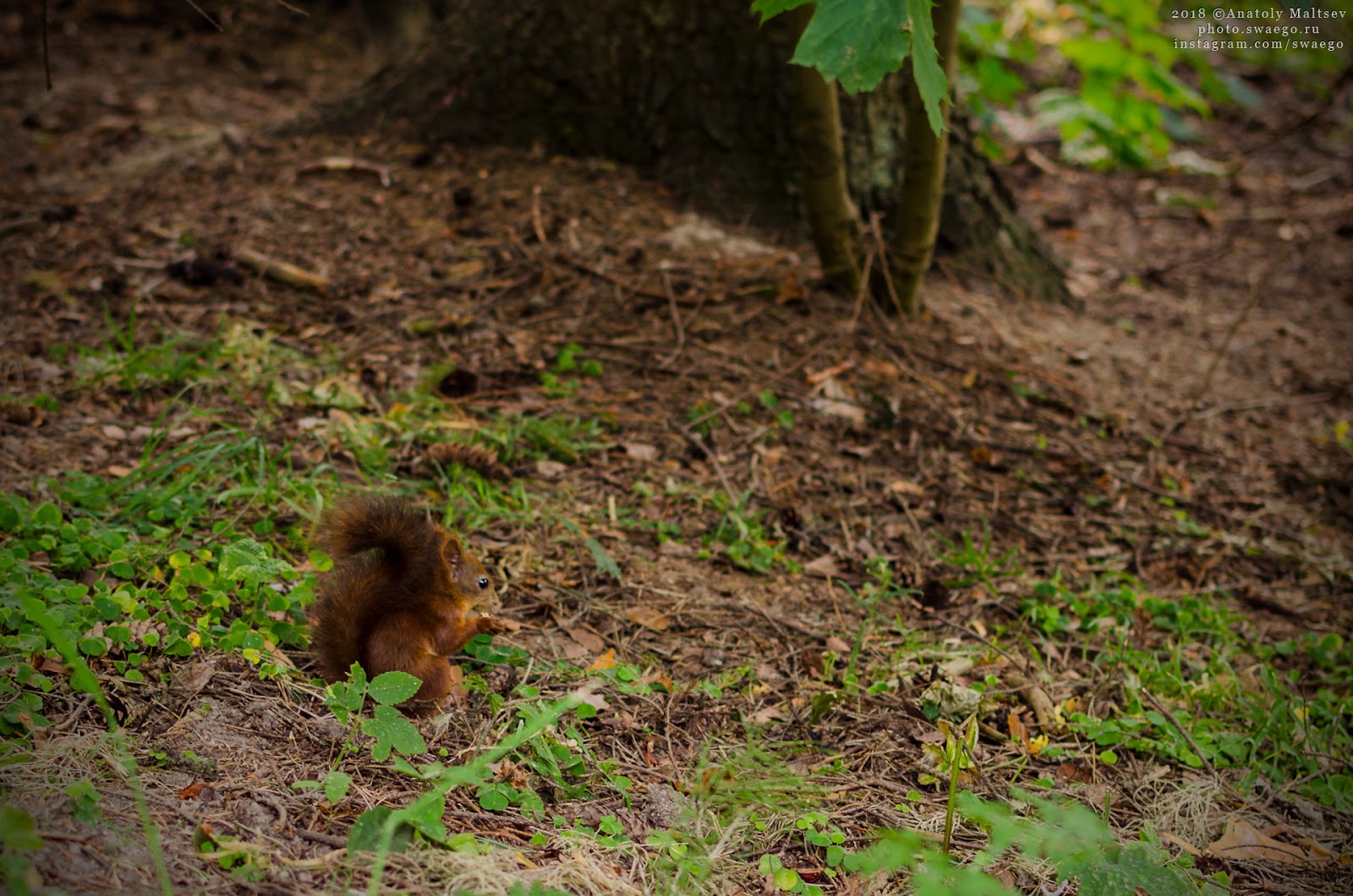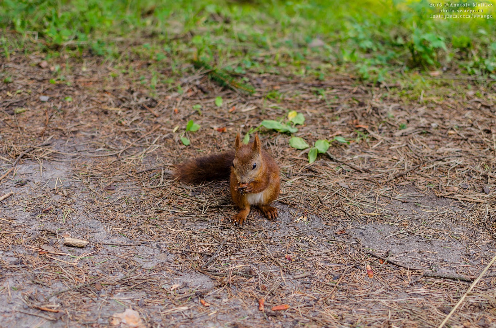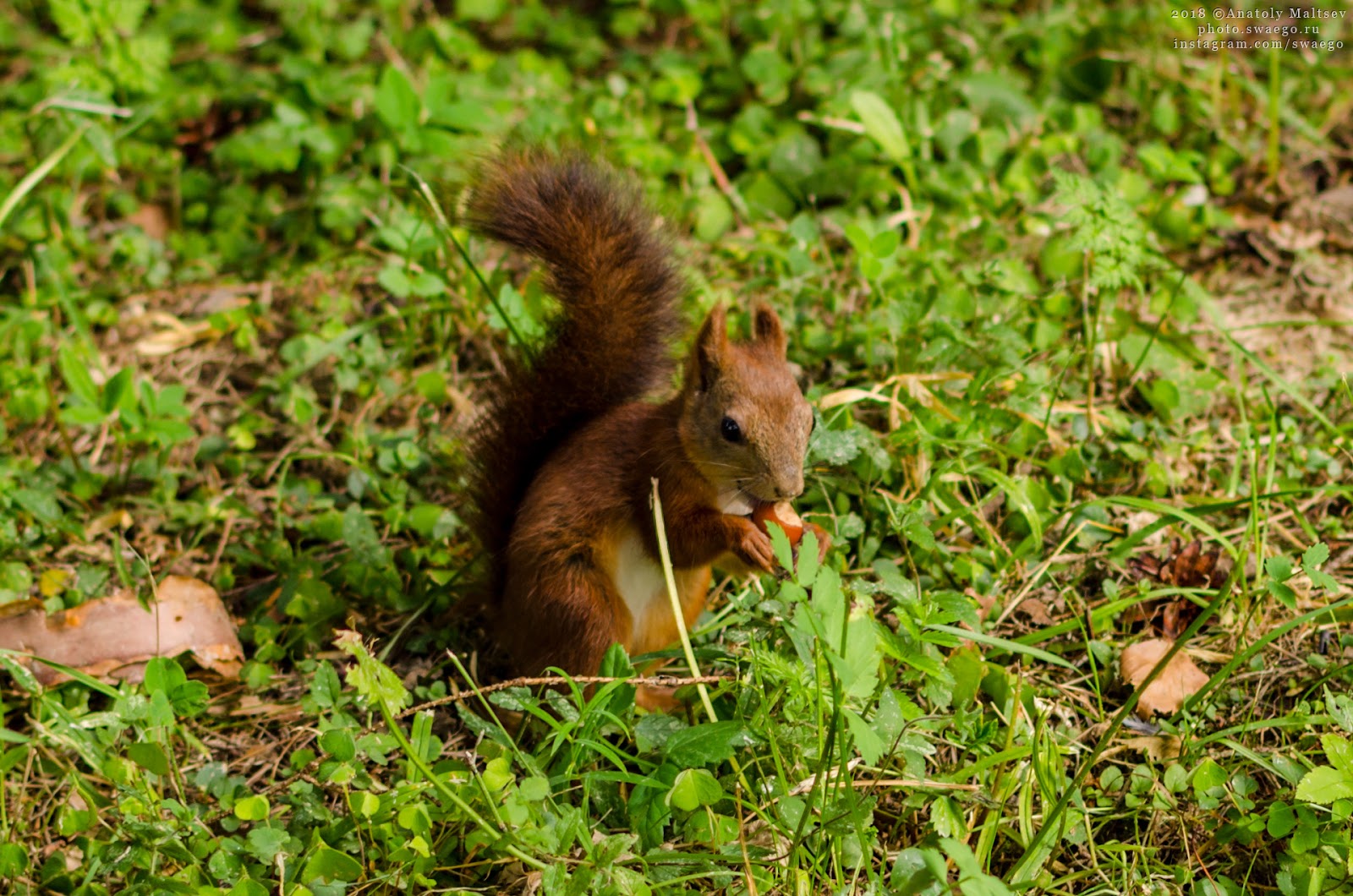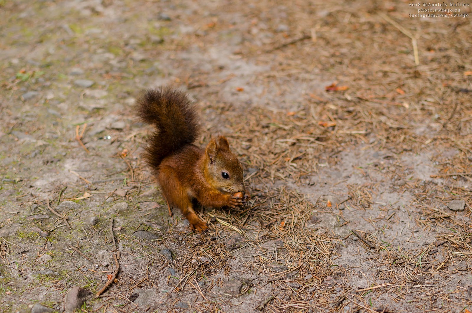 Встретил любопытную белку. Исхудала бедняжка. Накормил орехами и дал прозапас, которые она закапывала под деревьями.