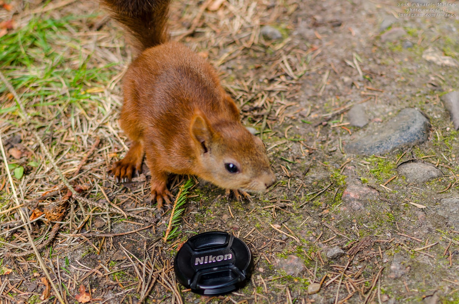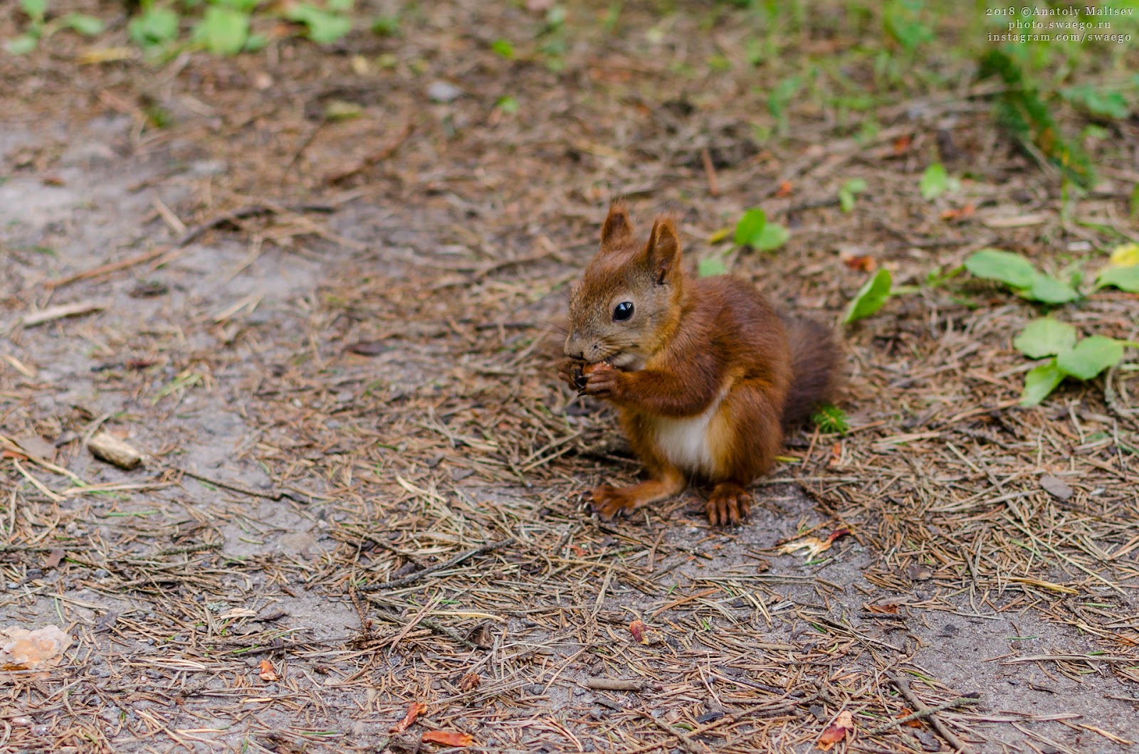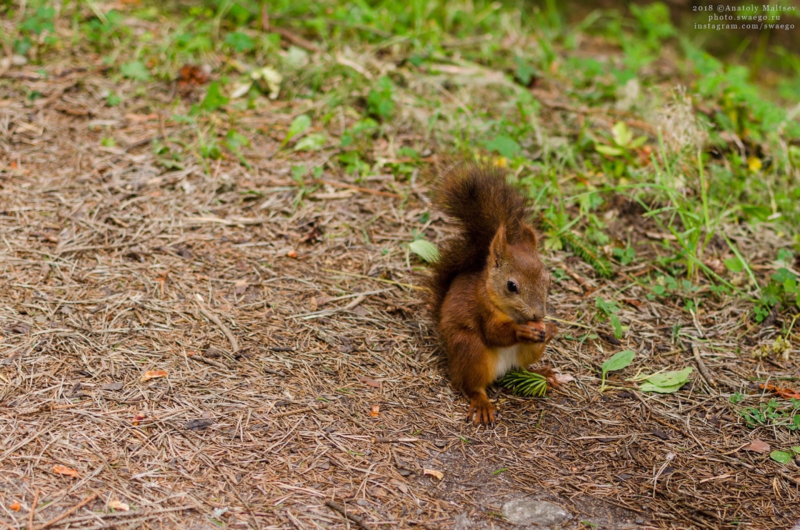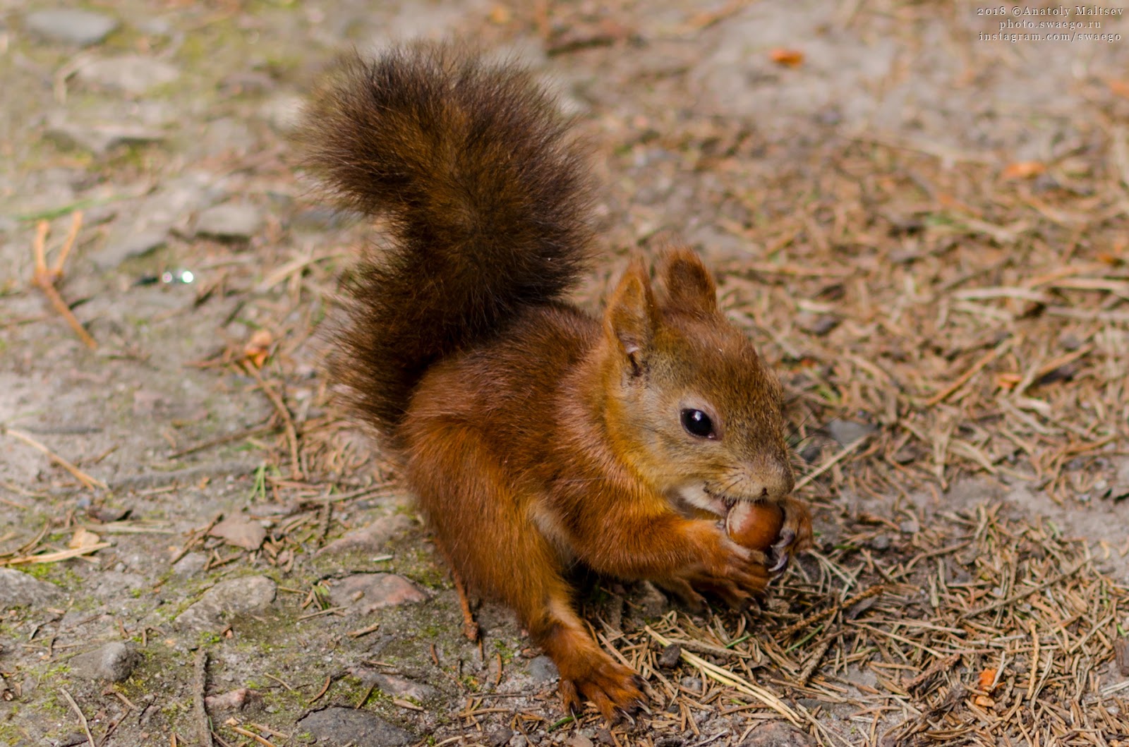 Встретил любопытную белку. Исхудала бедняжка. Накормил орехами и дал прозапас, которые она закапывала под деревьями.