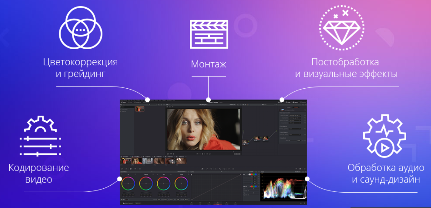DaVinci Resolve – самый мощный, самый полный и самый удобный программный комплекс для работы с видео. Это одновременно и программа для монтажа, и программа для цветокоррекции, и программа для работы со звуком, и программа для постобработки, и программа для создания визуальных эффектов. С DaVinci Resolve вам не придется больше экспортировать или переводить файлы между отдельными программами – весь творческий процесс будет происходить в рамках одной программы.