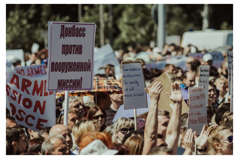 Митинг на площади Ленина против ввода вооружённой миссии ОБСЕ в Донбасс. Демонстранты несли плакаты с надписями «No armed OSCE mission», «Нет вооруженной миссии ОБСЕ», «Не допустим вооруженной миссии ОБСЕ в Донбассе», «Свою безопасность обеспечим сами!», «Вооруженная миссия = военная интервенция». 10 июня 2016, Донецк.