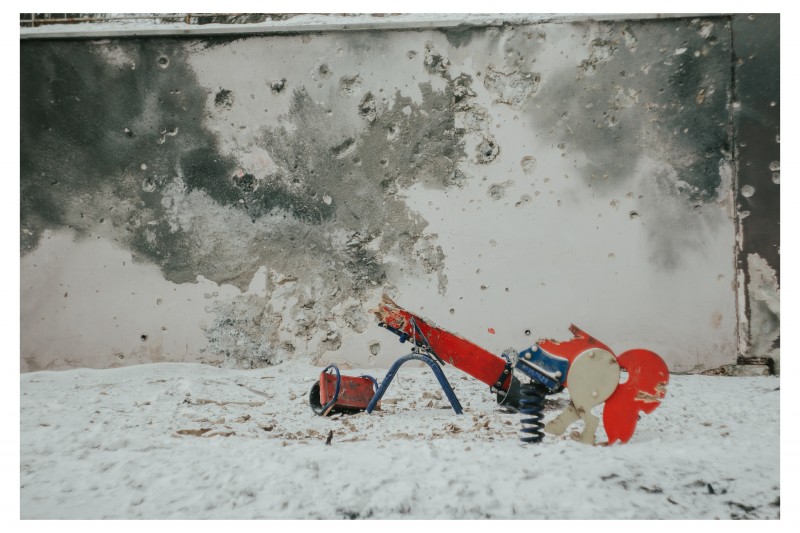 Детская площадка в Киевском районе Донецка. Разрушена в результате артиллерийского обстрела в период обострения вооруженного конфликта. 2 февраля 2017, Донецк.