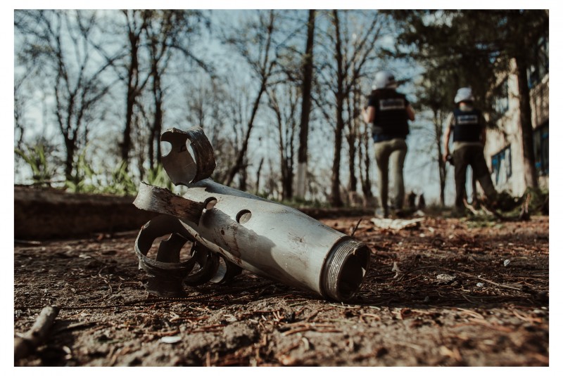 Останки снаряда возле разрушенного здания школы в посёлке Зайцево. На фоне — представители мониторинговой миссии ОБСЕ. Параллельно зеркальный патруль инспектирует противоположный населённый пункт, находящийся под контролем ВСУ. 12 апреля 2016, Зайцево.