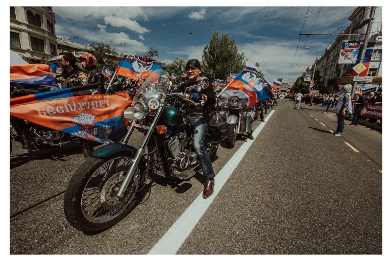 Мотоциклист во время автопробега по улице Артёма в честь годовщины Референдума, который состоялся 11 мая 2014 года. После колонны мотоциклистов по главной улице Донецка прошли жители Республики. 11 мая 2016, Донецк.