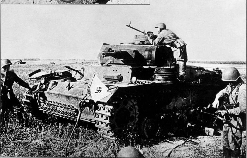 Подбитый немецкий танк T III из состава 3-го взвода 5-й роты. На заднем плане немецкий бронетранспортер.