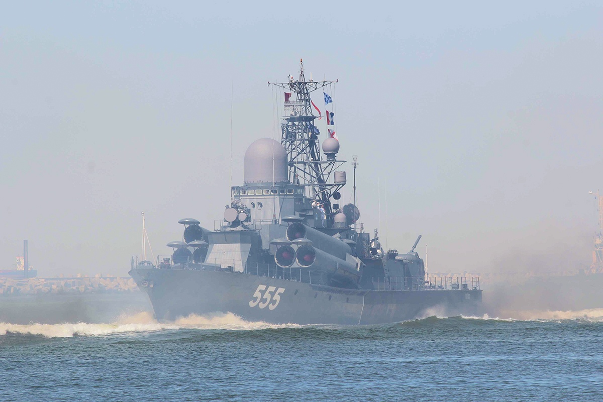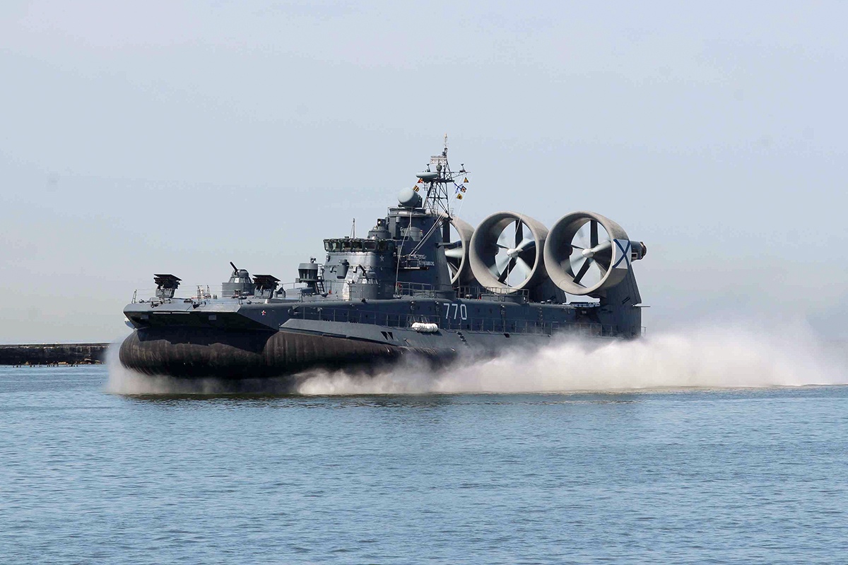 Самый большой в мире десантный корабль на воздушной подушке - балтийский "Евгений Кочешков" - а также корвет "Бойкий", МРК "Гейзер", "Зеленый Дол", подводная лодка "Дмитров" и другие корабли и суда обеспечения отрепетировали военно-морской парад в честь Дня ВМФ.