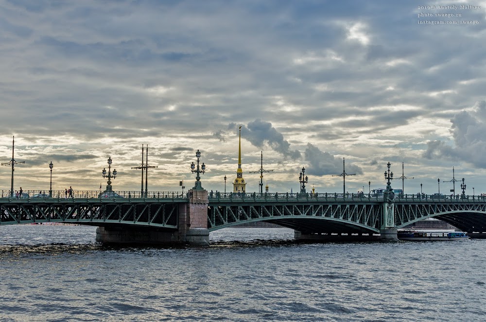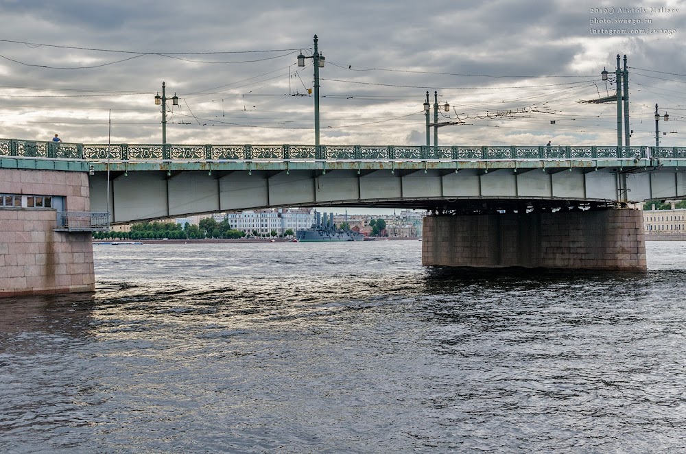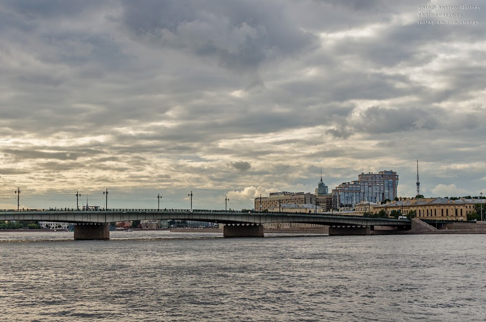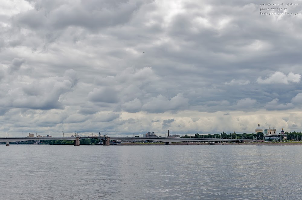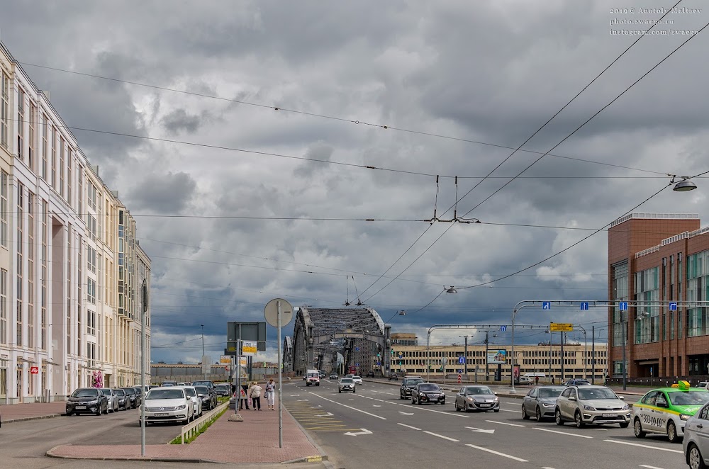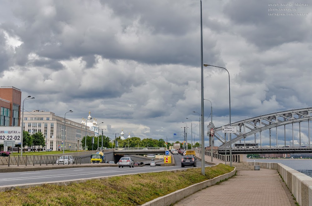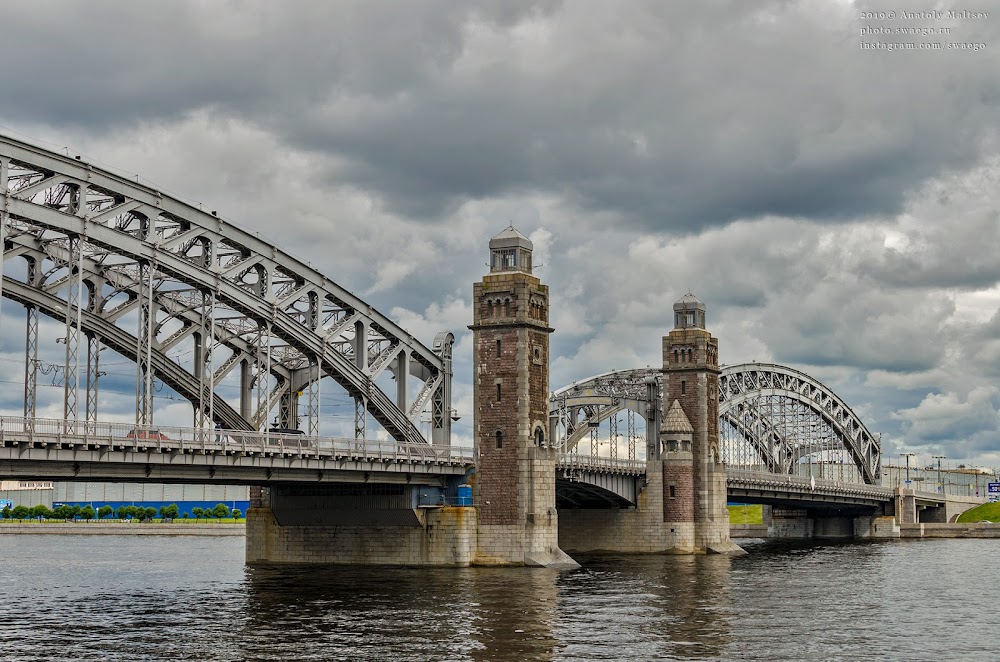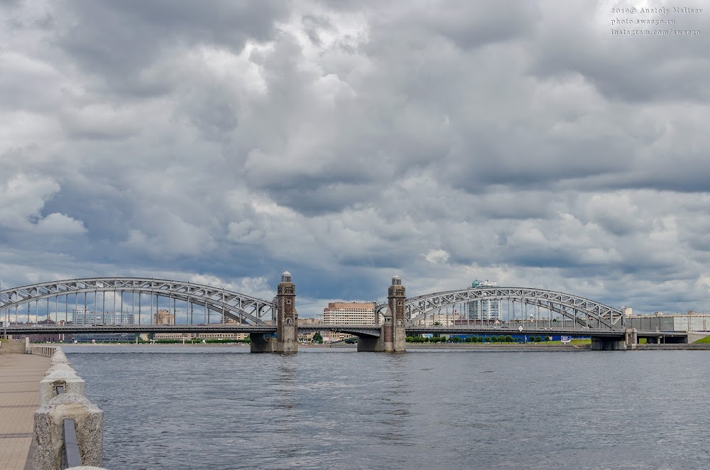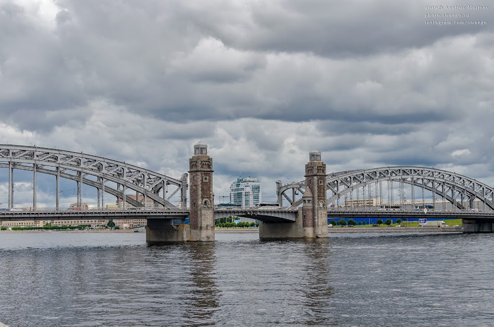 Большеохтинский мост (до 1917 года - мост Императора Петра Великого). Считаю его самым красивым мостом в Питере. Наиболее фактурно и эффектно он смотрится ночью, когда включена подсветка и видны "трассеры" машин. Красота