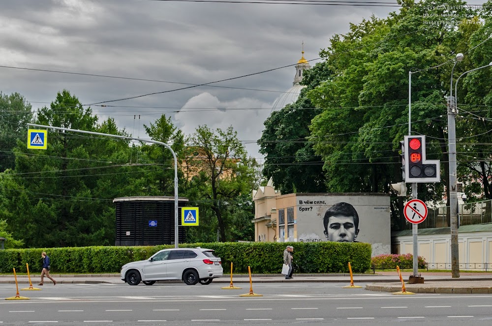 Знаменитое граффити "Брат" от художников из HoodGraff на стене трансформаторной подстанции на площади Александра Невского