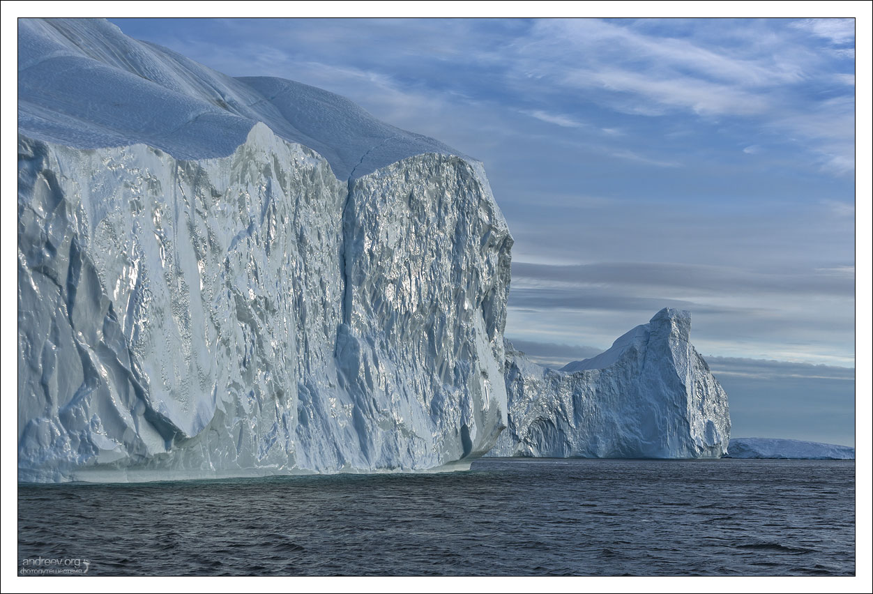 Айсберги, дрейфующие в Гренландии, обычно довольно высокие, тогда как в Антарктике — плоские. Надводная высота гренландских айсбергов колеблется в районе 100-110 метров. Это высота 30-этажного дома. Но гораздо внушительнее айсберг выглядит под водой. Поскольку плотность льда составляет 920 кг/м³, а плотность морской воды — около 1025 кг/м³, то 90% объёма айсберга скрыто от глаз. И если бы мы могли видеть одновременно в двух средах, то картина была бы такой: