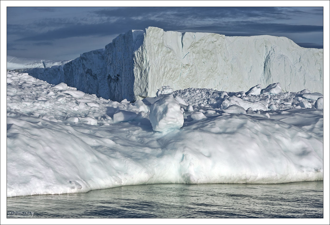 Гид сказал, что эти, ближайшие к Илулиссату айсберги, “grounded”, т.е. сидят на мели. Здесь больше всего «айсберговых банок» (от нем. Bank или нидерл. bank) из продуктов ледникового сноса на континентальном шельфе, где они образуют крупные отмели, вследствие чего айсберги садятся на мель. И вот они сидят и тают, годами, а то и десятилетиями.