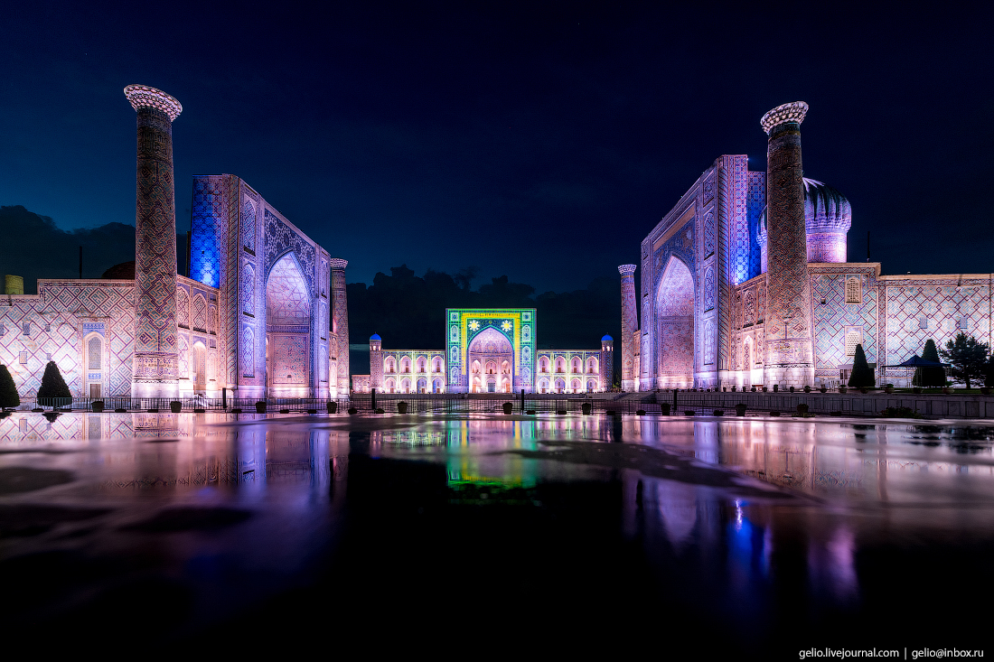13. Медресе Шер-Дор, возведенное через 200 лет после медресе Улугбека. Предполагалось, что это здание будет зеркальным отражением своего предшественника, но за 200 лет грунт просел, и новое медресе получилось чуть выше, однако визуально эта разница почти не видна.
